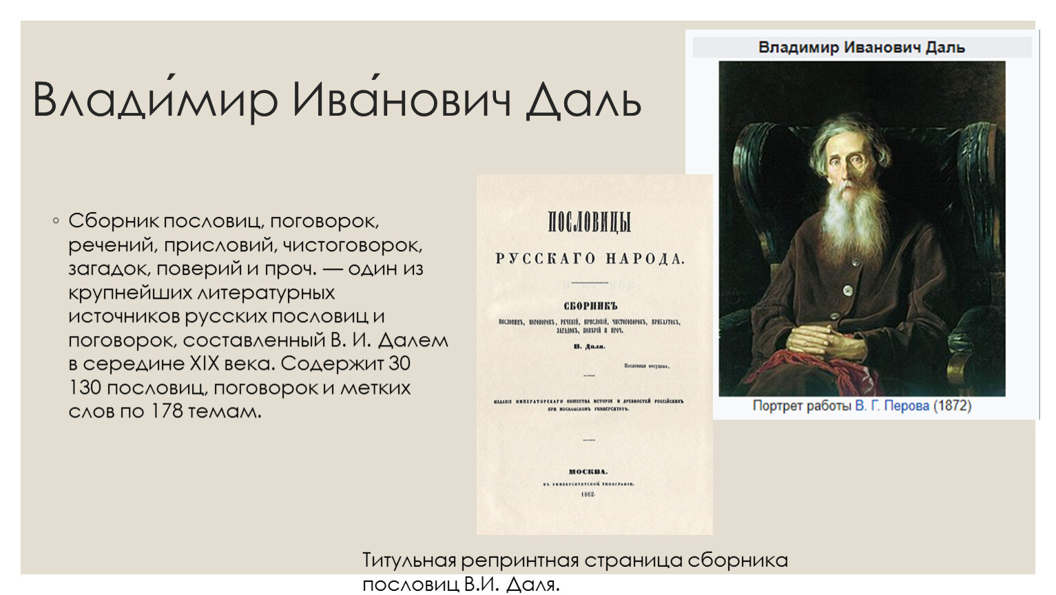 Титульная репринтная страница сборника пословиц В.И. Даля.