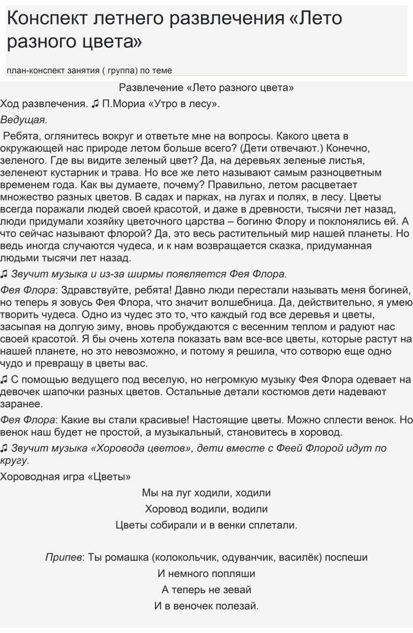 Ребята, оглянитесь вокруг и ответьте мне на вопросы. Какого цвета в окружающей нас природе летом больше всего? (Дети отвечают.) Конечно, зеленого. Где вы видите зеленый цвет? Да, на деревьях зеленые листья, зеленеют кустарник и трава. Но все же лето называют самым разноцветным временем года. Как вы думаете, почему? Правильно, летом расцветает множество разных цветов. В садах и парках, на лугах и полях, в лесу. Цветы всегда поражали людей своей красотой, и даже в древности, тысячи лет назад, люди придумали хозяйку цветочного царства – богиню Флору и поклонялись ей. А что сейчас называют флорой? Да, это весь растительный мир нашей планеты. Но ведь иногда случаются чудеса, и к нам возвращается сказка, придуманная людьми тысячи лет назад.