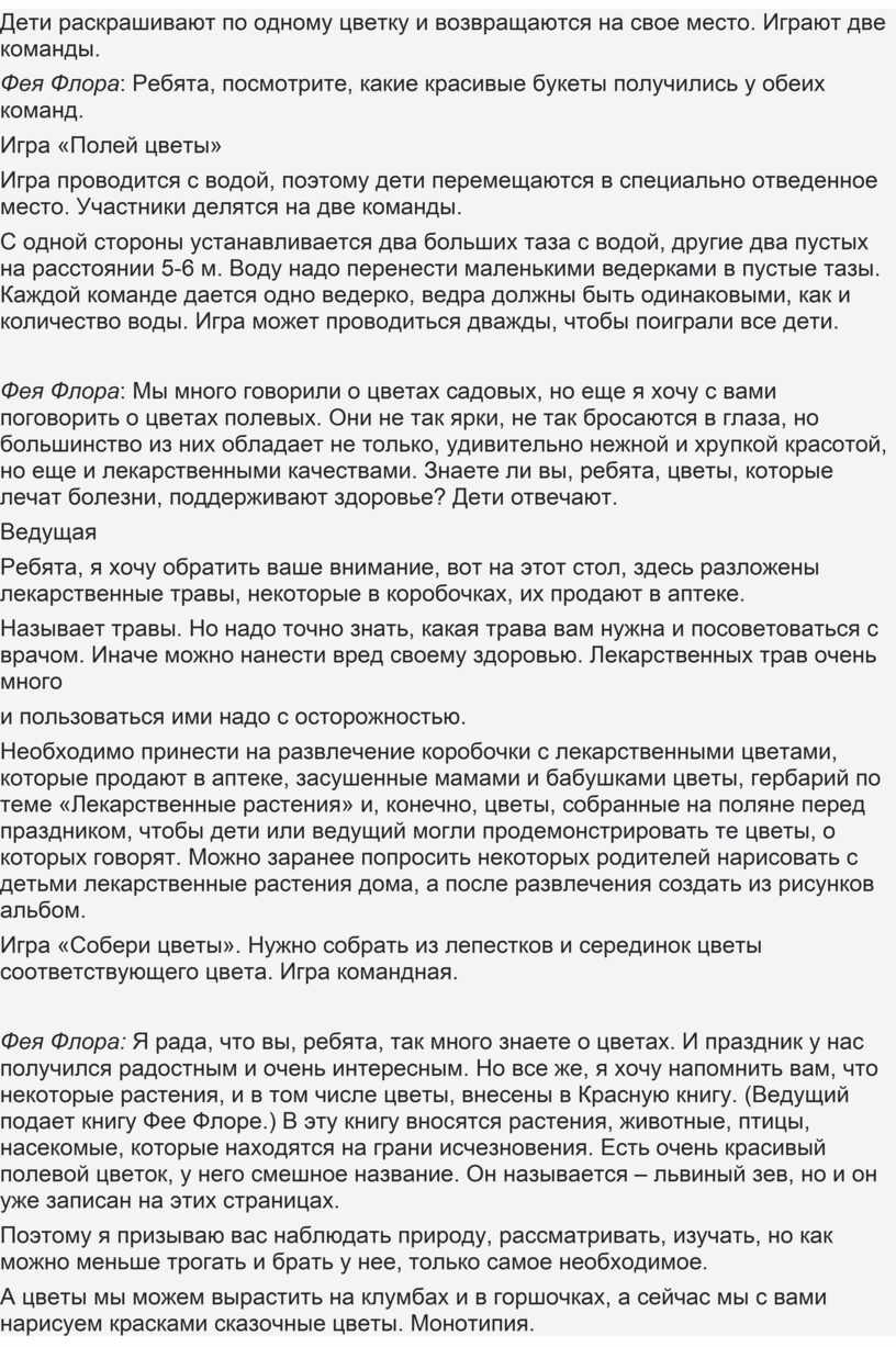 Фея Флора: Здравствуйте, ребята! Давно люди перестали называть меня богиней, но теперь я зовусь Фея Флора, что значит волшебница. Да, действительно, я умею творить чудеса. Одно из чудес это то, что каждый год все деревья и цветы, засыпая на долгую зиму, вновь пробуждаются с весенним теплом и радуют нас своей красотой. Я бы очень хотела показать вам все-все цветы, которые растут на нашей планете, но это невозможно, и потому я решила, что сотворю еще одно чудо и превращу в цветы вас.