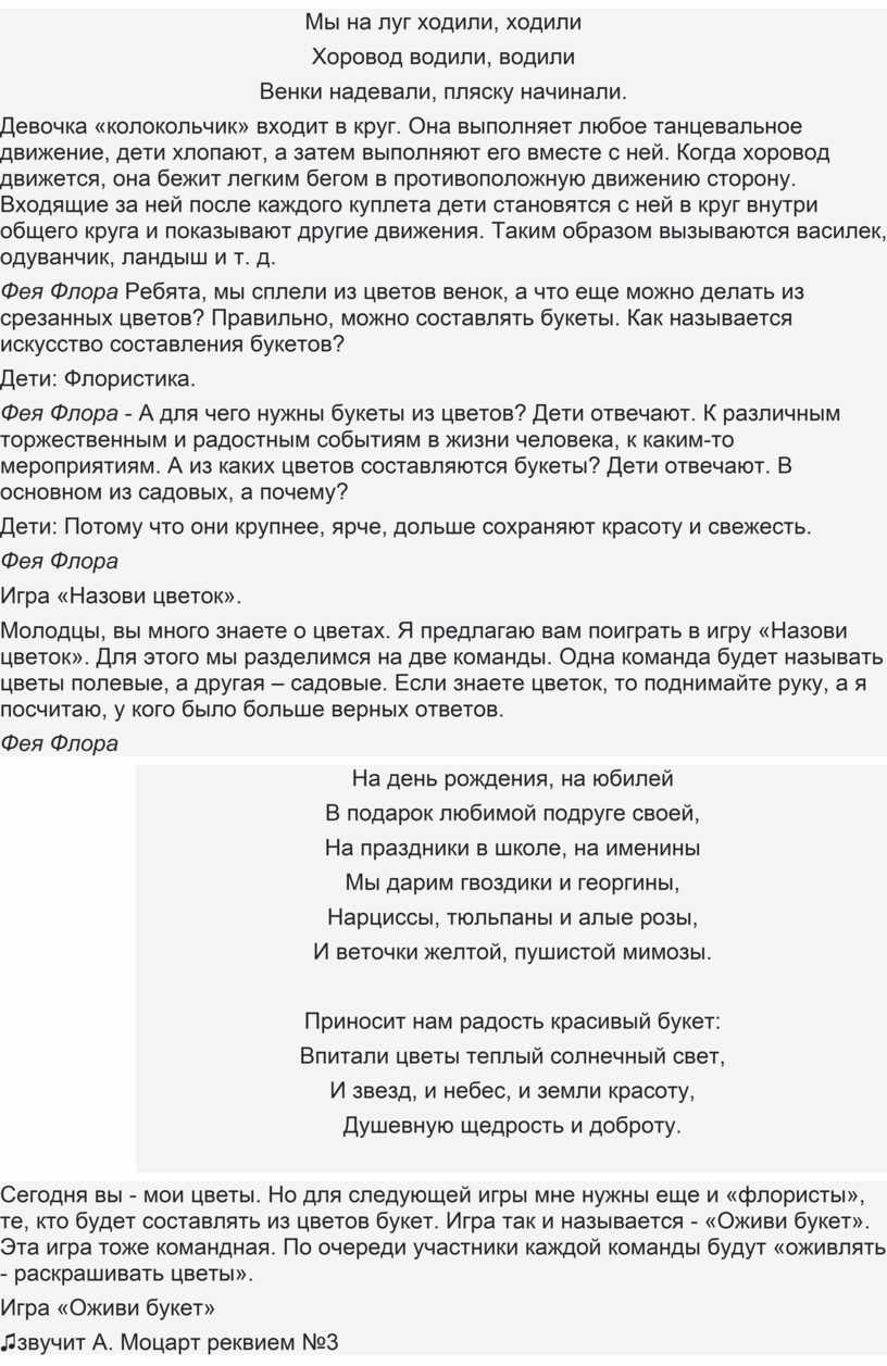 Фея Флора: Какие вы стали красивые! Настоящие цветы. Можно сплести венок. Но венок наш будет не простой, а музыкальный, становитесь в хоровод.