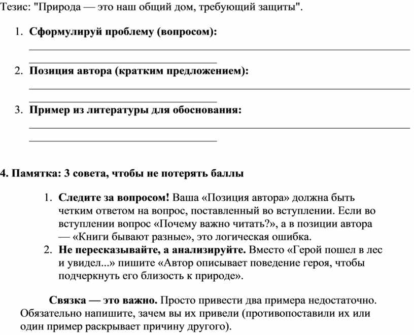 1. Следите за вопросом! Ваша «Позиция автора» должна быть четким ответом на вопрос, поставленный во вступлении. Если во вступлении вопрос «Почему важно читать?», а в позиции автора — «Книги бывают разные», это логическая ошибка.