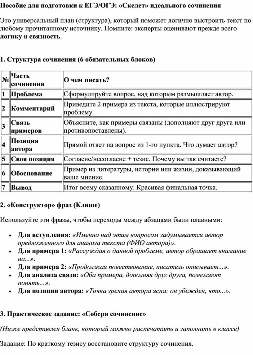 Пособие для подготовки к ЕГЭ/ОГЭ: «Скелет» идеального сочинения