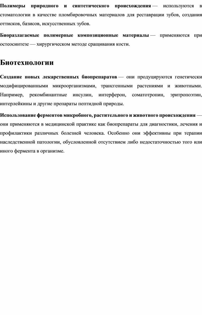 · Полимеры природного и синтетического происхождения — используются в стоматологии в качестве пломбировочных материалов для реставрации зубов, создания оттисков, базисов, искусственных зубов.