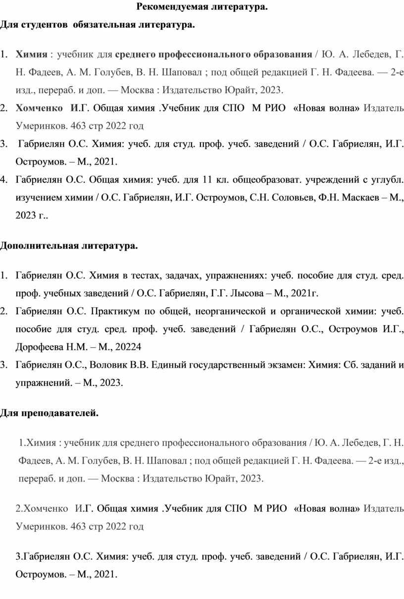 1. Химия : учебник для среднего профессионального образования / Ю. А. Лебедев, Г. Н. Фадеев, А. М. Голубев, В. Н. Шаповал ; под общей редакцией Г. Н. Фадеева. — 2-е изд., перераб. и доп. — Москва : Издательство Юрайт, 2023.