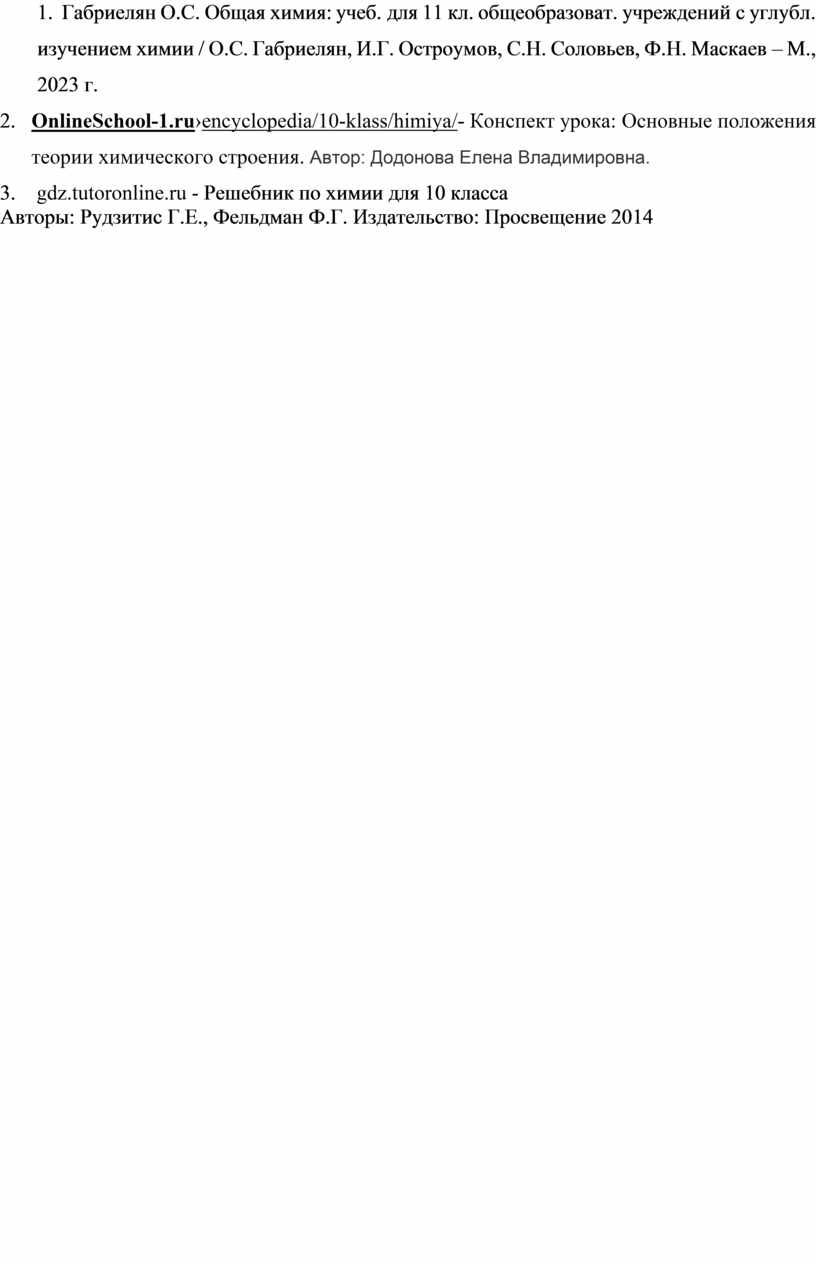 6. OnlineSchool-1.ru›encyclopedia/10-klass/himiya/- Конспект урока: Основные положения теории химического строения. Автор: Додонова Елена Владимировна.