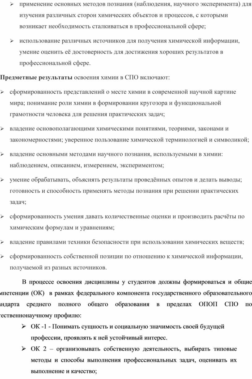 Предметные результаты освоения химии в СПО включают: