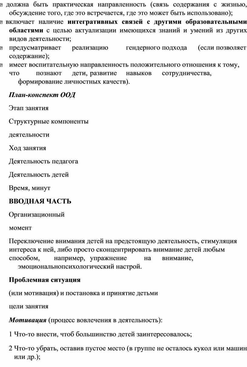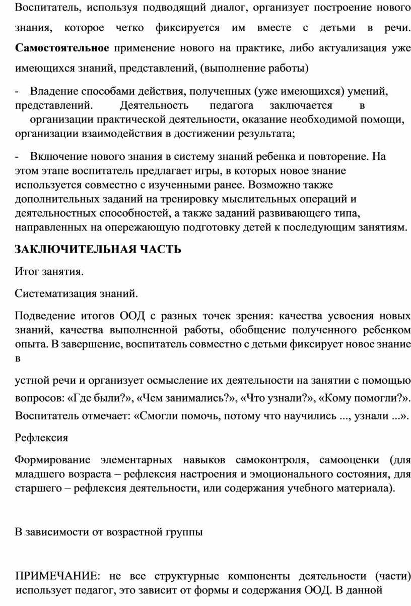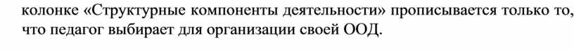 ПРИМЕЧАНИЕ: не все структурные компоненты деятельности (части) использует педагог, это зависит от формы и содержания ООД. В данной колонке «Структурные компоненты деятельности» прописывается только то, что педагог выбирает для организации своей ООД.