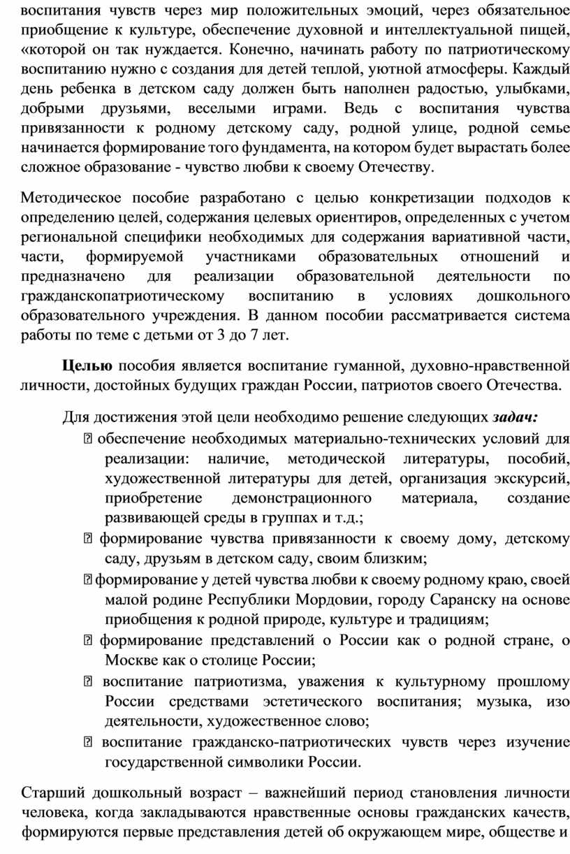 Мое пособие — это попытка движения от воспитания простых чувств к достижению наивысшей цели - воспитанию чувств патриотических, любви и гордости за Родину, за родной город Саранск.