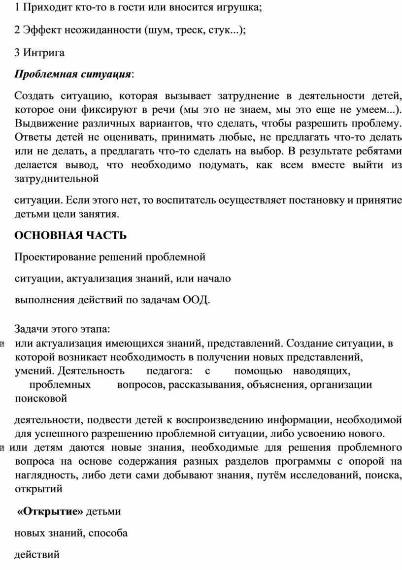 деятельности, подвести детей к воспроизведению информации, необходимой для успешного разрешению проблемной ситуации, либо усвоению нового.