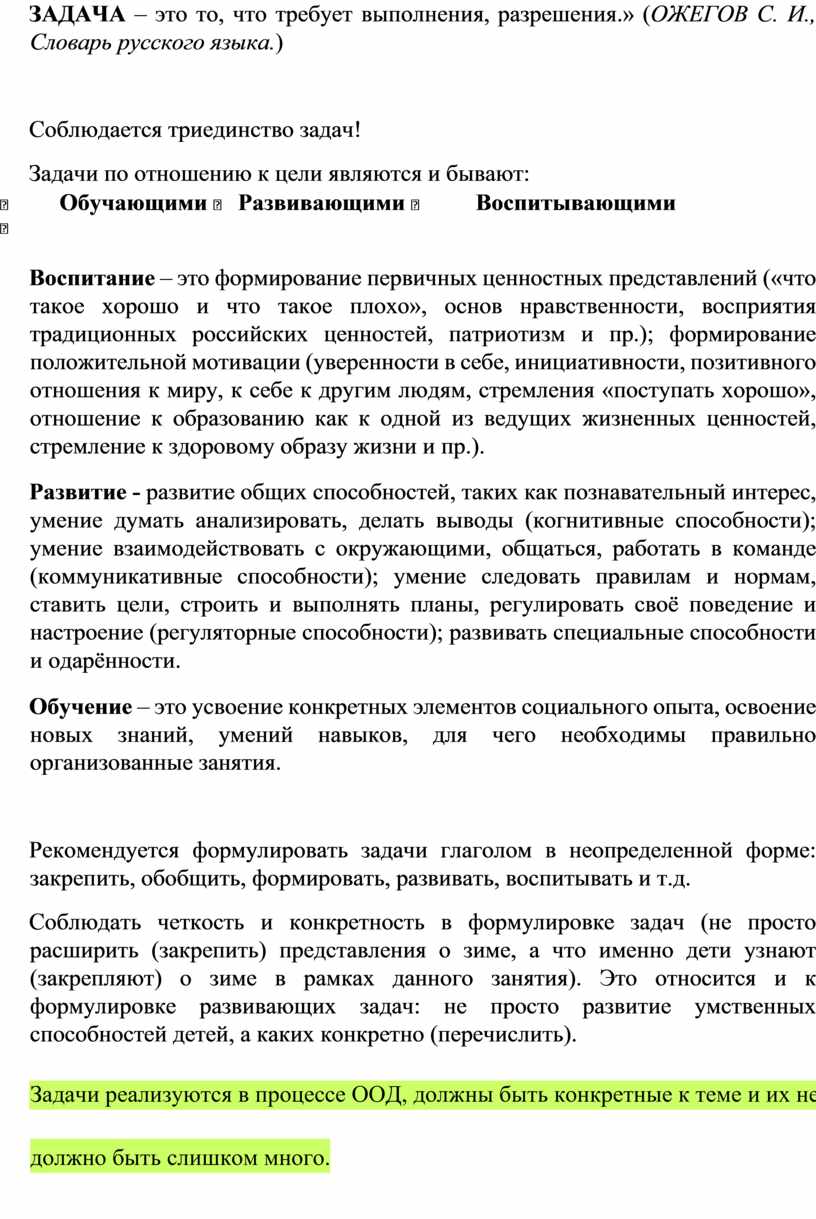 Задачи реализуются в процессе ООД, должны быть конкретные к теме и их не |