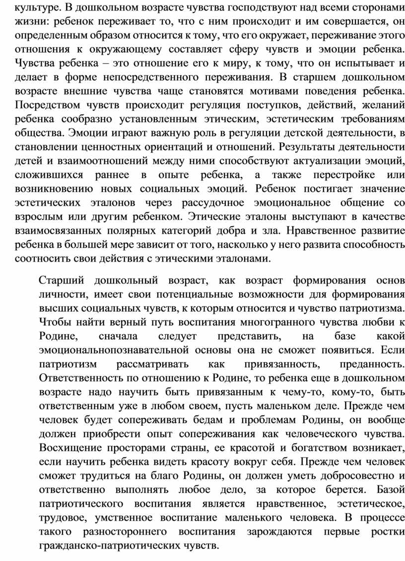 Старший дошкольный возраст, как возраст формирования основ личности, имеет свои потенциальные возможности для формирования высших социальных чувств, к которым относится и чувство патриотизма. Чтобы найти верный путь воспитания многогранного чувства любви к Родине, сначала следует представить, на базе какой эмоциональнопознавательной основы она не сможет появиться. Если патриотизм рассматривать как привязанность, преданность. Ответственность по отношению к Родине, то ребенка еще в дошкольном возрасте надо научить быть привязанным к чему-то, кому-то, быть ответственным уже в любом своем, пусть маленьком деле. Прежде чем человек будет сопереживать бедам и проблемам Родины, он вообще должен приобрести опыт сопереживания как человеческого чувства. Восхищение просторами страны, ее красотой и богатством возникает, если научить ребенка видеть красоту вокруг себя. Прежде чем человек сможет трудиться на благо Родины, он должен уметь добросовестно и ответственно выполнять любое дело, за которое берется. Базой патриотического воспитания является нравственное, эстетическое, трудовое, умственное воспитание маленького человека. В процессе такого разностороннего воспитания зарождаются первые ростки гражданско-патриотических чувств.