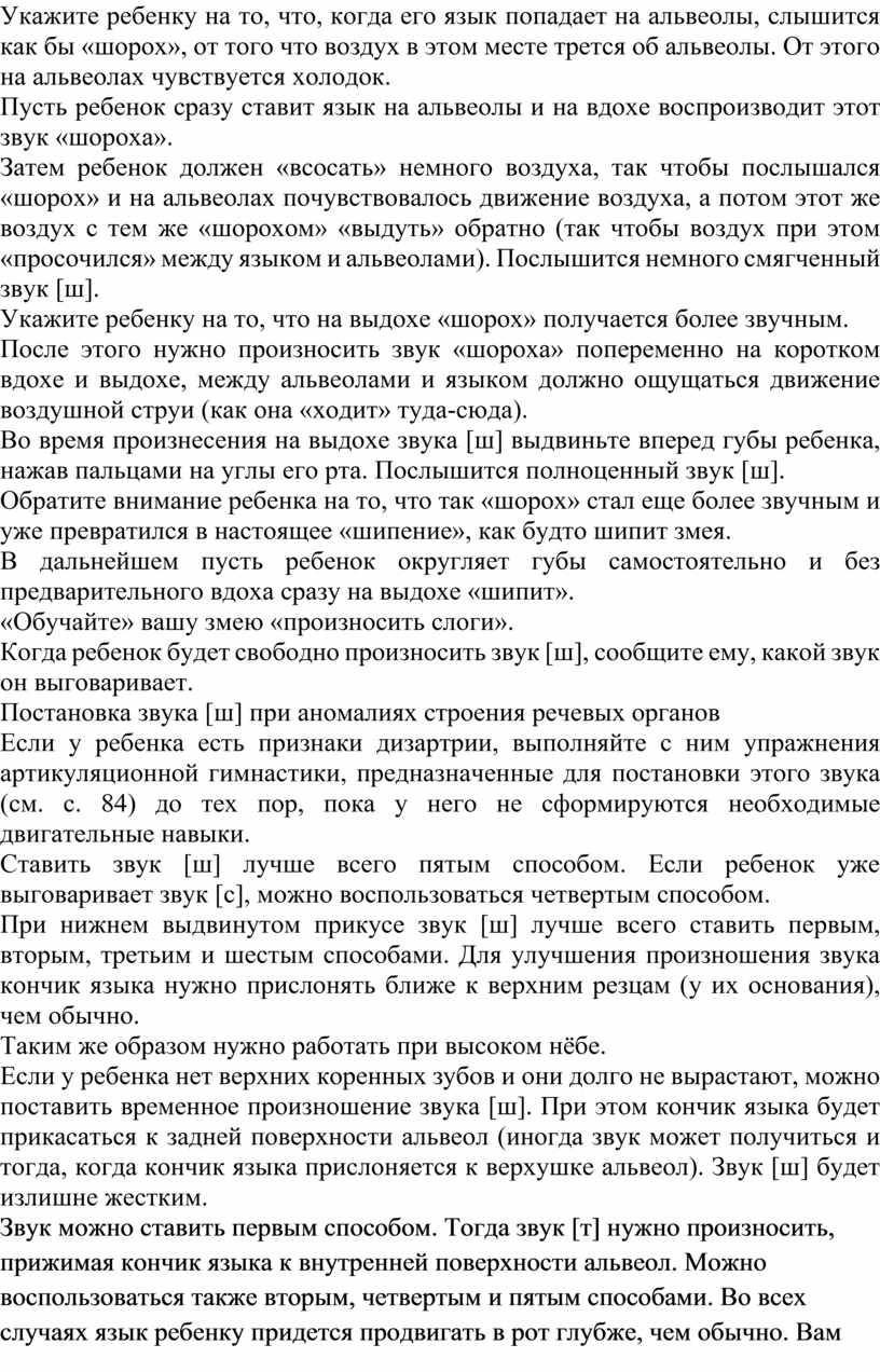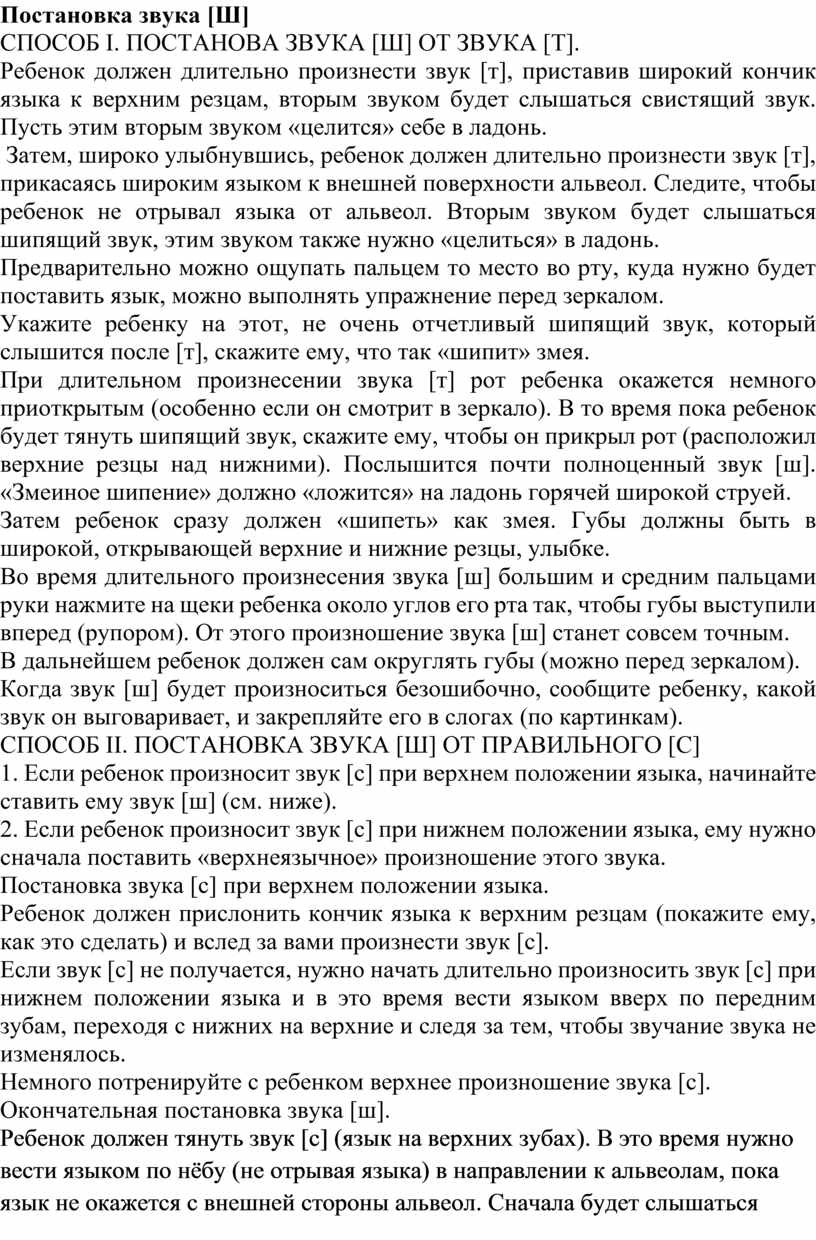 Ставить звук [ш] лучше всего пятым способом. Если ребенок уже выговаривает звук [с], можно воспользоваться четвертым способом.