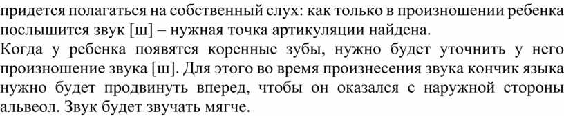 Когда у ребенка появятся коренные зубы, нужно будет уточнить у него произношение звука [ш]. Для этого во время произнесения звука кончик языка нужно будет продвинуть вперед, чтобы он оказался с наружной стороны альвеол. Звук будет звучать мягче.
