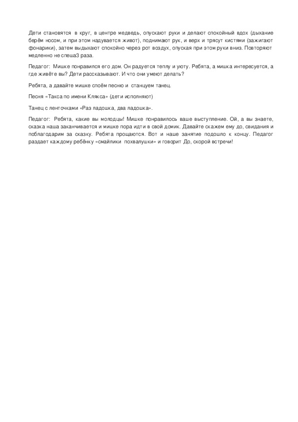 Педагог: Ребята, какие вы молодцы! Мишке понравилось ваше выступление. Ой, а вы знаете,
