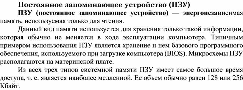 Данный вид памяти используется для хранения только такой информации, которая обычно не меняется в ходе эксплуатации компьютера. Типичным примером использования ПЗУ является хранение н нем базового программного обеспечения, используемого при загрузке компьютера (BIOS). Микросхемы ПЗУ располагаются на материнской плате.