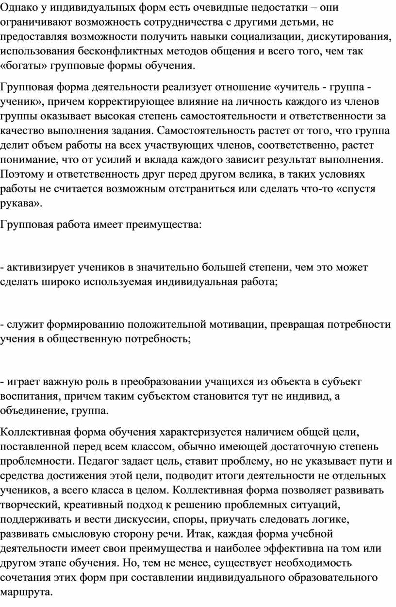 Коллективная форма обучения характеризуется наличием общей цели, поставленной перед всем классом, обычно имеющей достаточную степень проблемности. Педагог задает цель, ставит проблему, но не указывает пути и средства достижения этой цели, подводит итоги деятельности не отдельных учеников, а всего класса в целом. Коллективная форма позволяет развивать творческий, креативный подход к решению проблемных ситуаций, поддерживать и вести дискуссии, споры, приучать следовать логике, развивать смысловую сторону речи. Итак, каждая форма учебной деятельности имеет свои преимущества и наиболее эффективна на том или другом этапе обучения. Но, тем не менее, существует необходимость сочетания этих форм при составлении индивидуального образовательного маршрута.