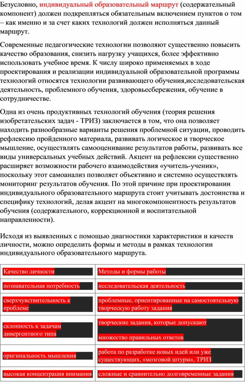 Безусловно, индивидуальный образовательный маршрут (содержательный компонент) должен подкрепляться обязательным включением пунктов о том – как именно и за счет каких технологий должен исполняться данный маршрут.