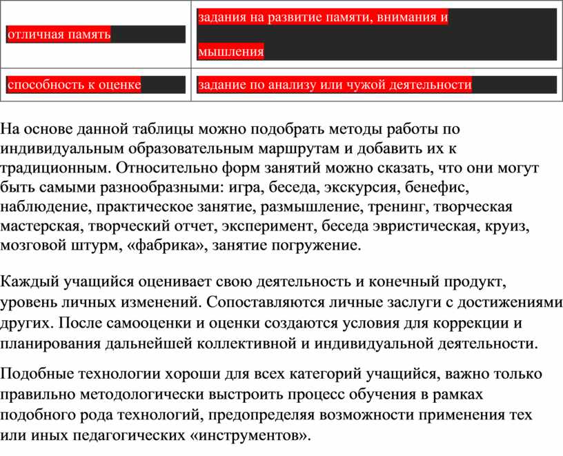 На основе данной таблицы можно подобрать методы работы по индивидуальным образовательным маршрутам и добавить их к традиционным. Относительно форм занятий можно сказать, что они могут быть самыми разнообразными: игра, беседа, экскурсия, бенефис, наблюдение, практическое занятие, размышление, тренинг, творческая мастерская, творческий отчет, эксперимент, беседа эвристическая, круиз, мозговой штурм, «фабрика», занятие погружение.