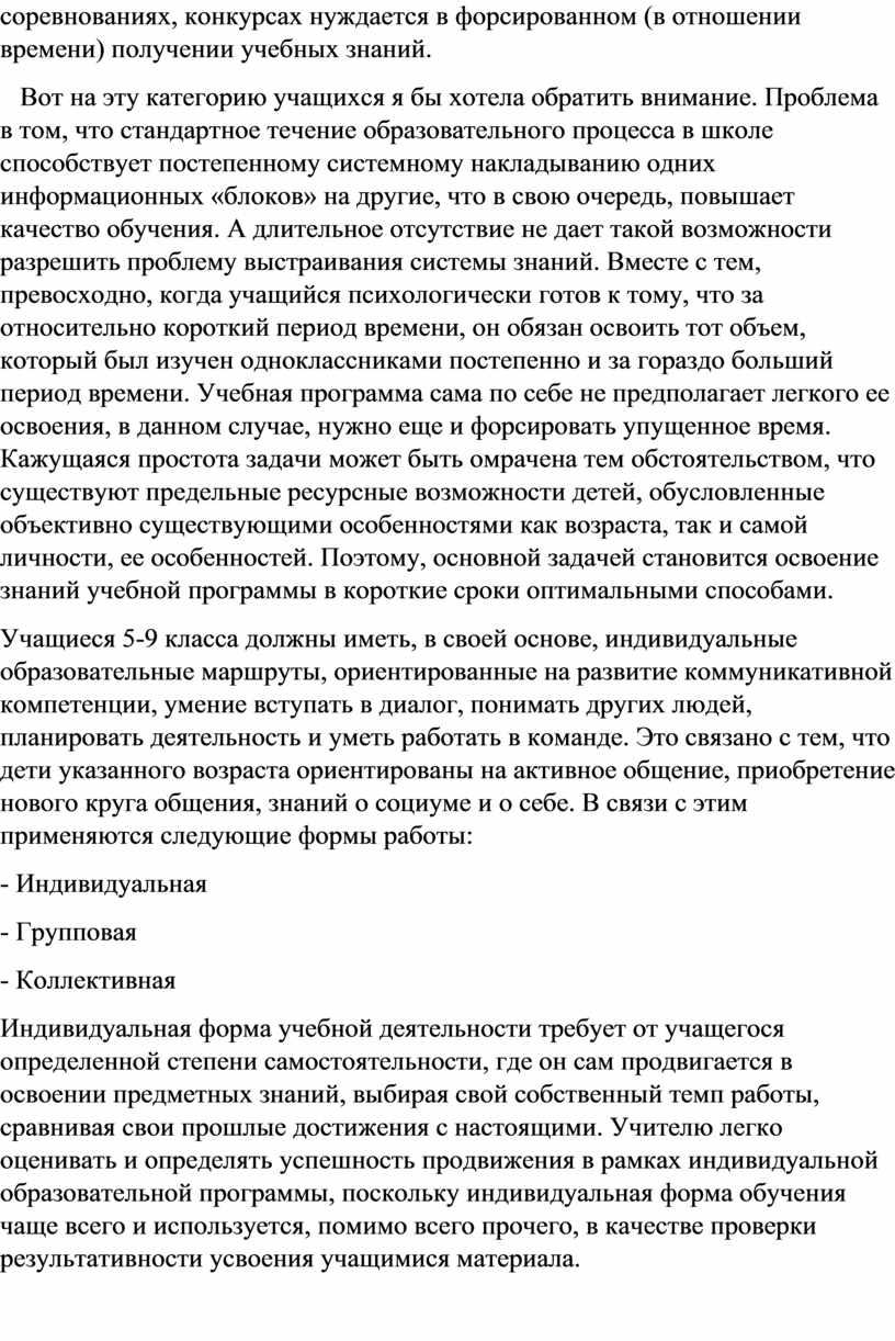 - Одной из часто встречающихся, является категория отсутствовавших на учебных занятиях, вследствие необходимости участия в спортивных соревнованиях, конкурсах нуждается в форсированном (в отношении времени) получении учебных знаний.