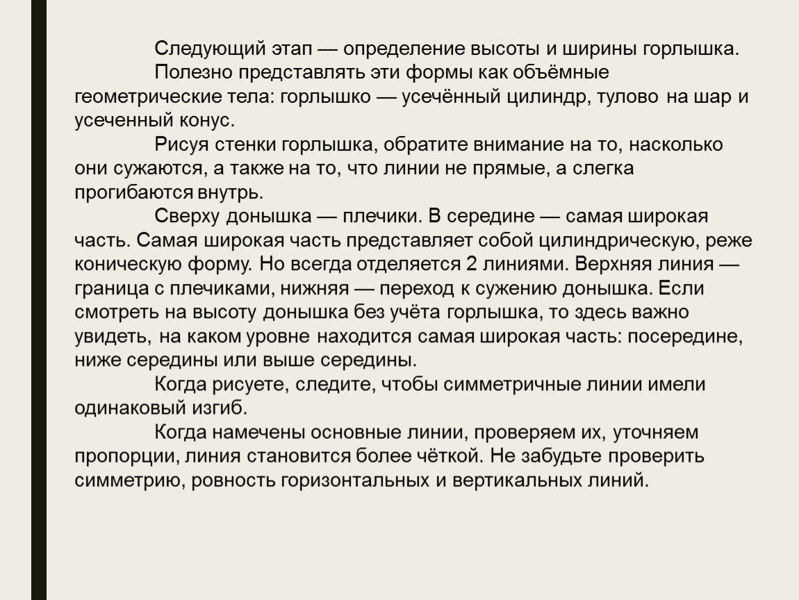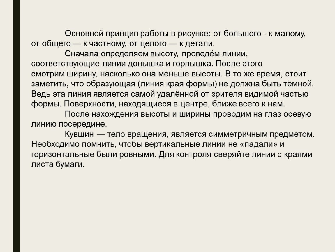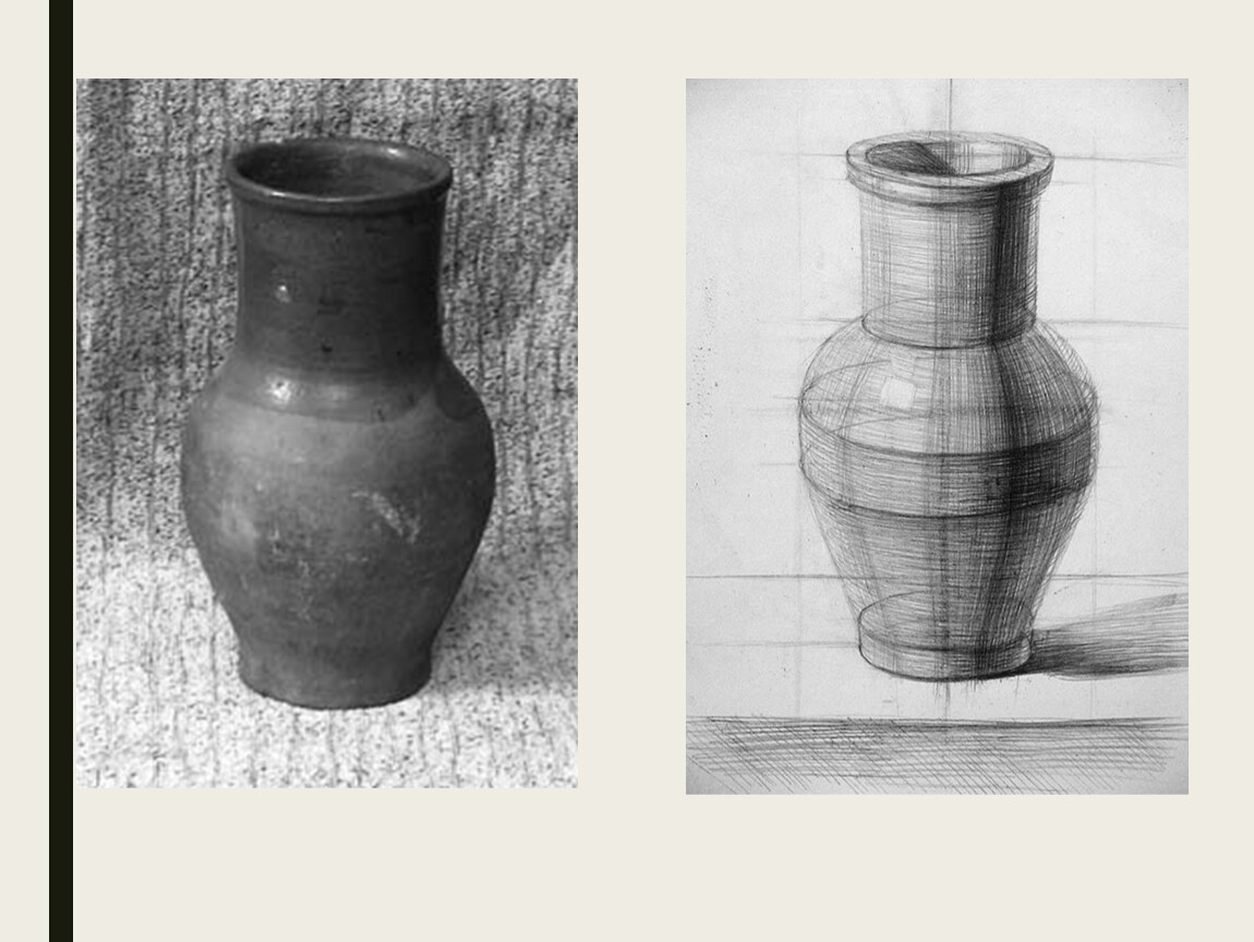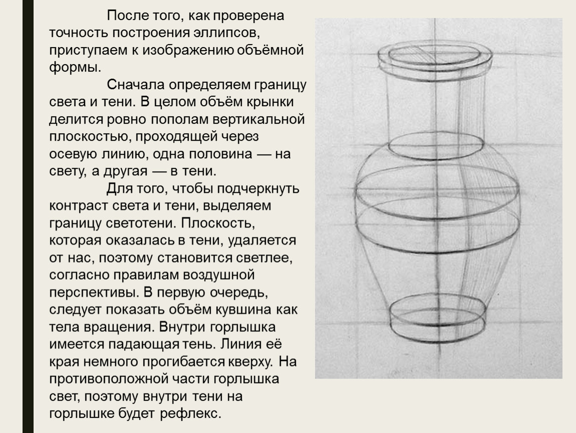 Основной принцип работы в рисунке: от большого - к малому, от общего — к частному, от целого — к детали. Сначала определяем высоту, проведём линии, соответствующие линии донышка и горлышка. После этого смотрим ширину, насколько она меньше высоты. В то же время, стоит заметить, что образующая (линия края формы) не должна быть тёмной. Ведь эта линия является самой удалённой от зрителя видимой частью формы. Поверхности, находящиеся в центре, ближе всего к нам.