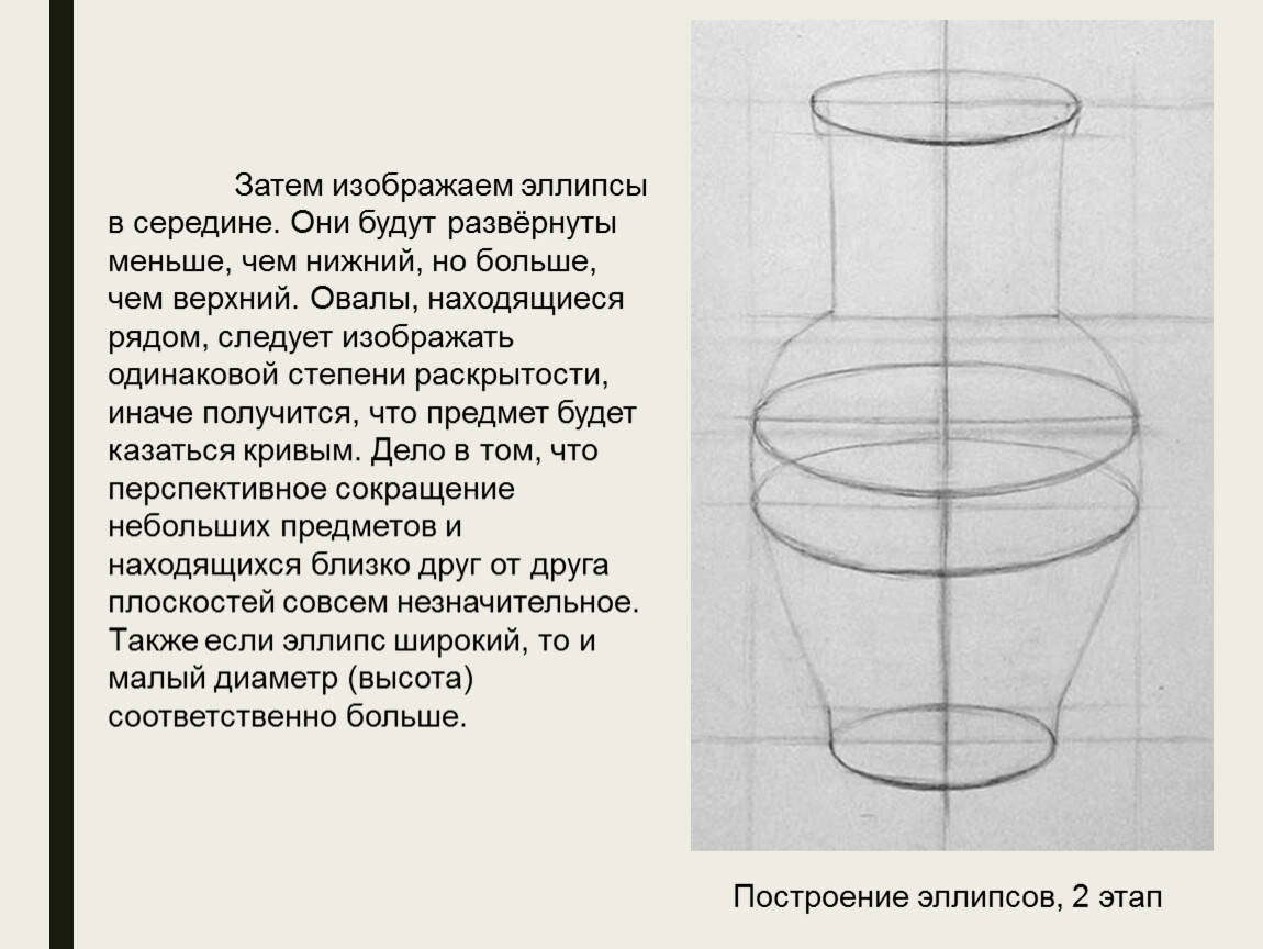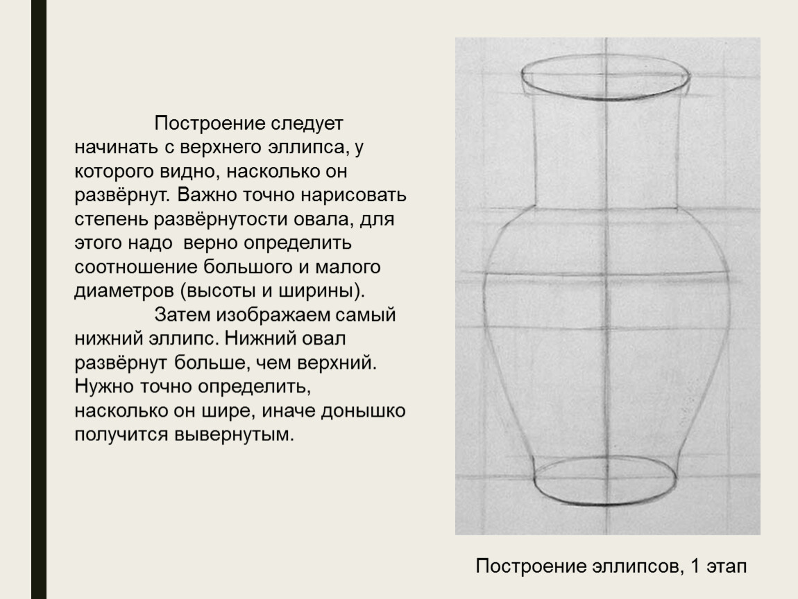 Построение следует начинать с верхнего эллипса, у которого видно, насколько он развёрнут. Важно точно нарисовать степень развёрнутости овала, для этого надо верно определить соотношение большого и малого диаметров (высоты и ширины). Затем изображаем самый нижний эллипс. Нижний овал развёрнут больше, чем верхний. Нужно точно определить, насколько он шире, иначе донышко получится вывернутым.
