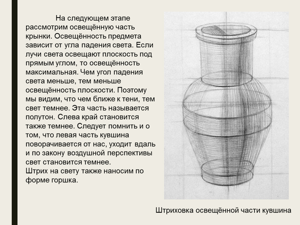 На следующем этапе рассмотрим освещённую часть крынки. Освещённость предмета зависит от угла падения света. Если лучи света освещают плоскость под прямым углом, то освещённость максимальная. Чем угол падения света меньше, тем меньше освещённость плоскости. Поэтому мы видим, что чем ближе к тени, тем свет темнее. Эта часть называется полутон. Слева край становится также темнее. Следует помнить и о том, что левая часть кувшина поворачивается от нас, уходит вдаль и по закону воздушной перспективы свет становится темнее.