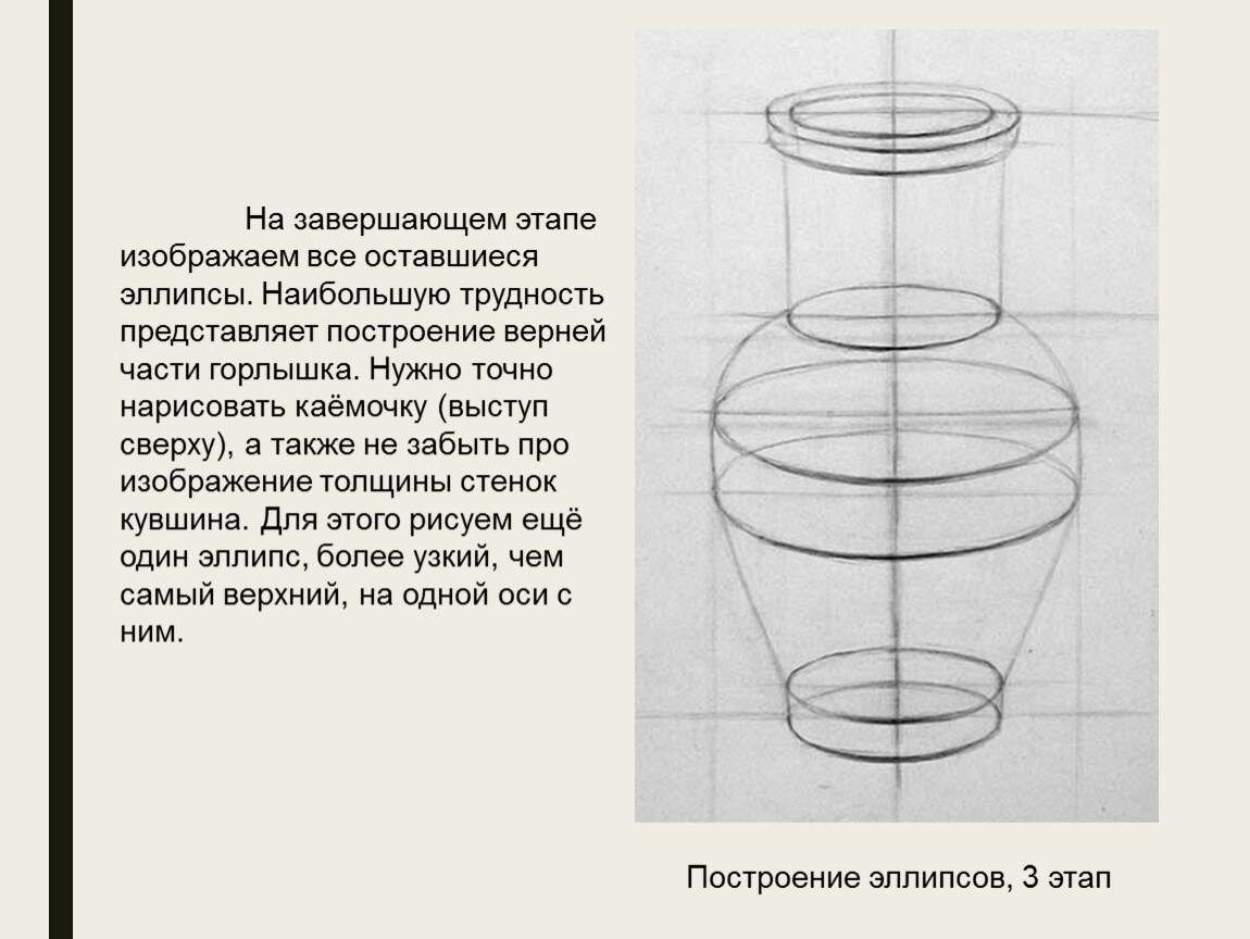 На завершающем этапе изображаем все оставшиеся эллипсы. Наибольшую трудность представляет построение верней части горлышка. Нужно точно нарисовать каёмочку (выступ сверху), а также не забыть про изображение толщины стенок кувшина. Для этого рисуем ещё один эллипс, более узкий, чем самый верхний, на одной оси с ним.