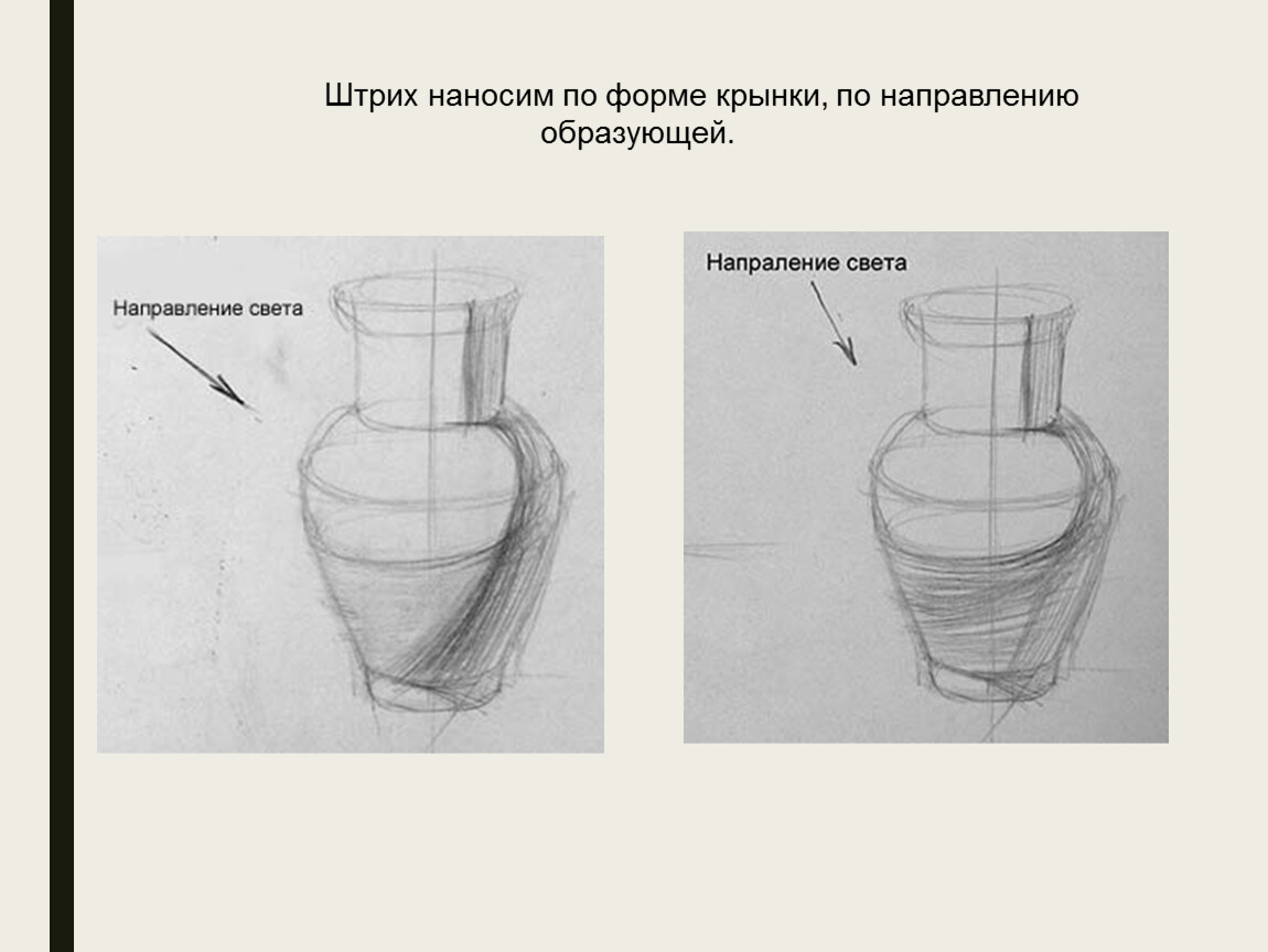Так как свет неравномерно освещает разные части кувшина, определим разницу в их освещённости. В нашем случае больше всего освещены плечики, меньше всего освещено донышко. Штрихом, положенным по форме кувшина, но уже по горизонтальным линиям разреза, покажем разницу в освещении. При этом мы не затрагиваем теневую часть. Иногда ошибочно штрихуют сразу весь предмет, это неправильно. Не всегда оказывается, что темной части на свету соответствует тёмная часть в тени, светлота теней зависит не от источника света, а от рефлексов (отражённого света от освещённый поверхностей вокруг крынки).