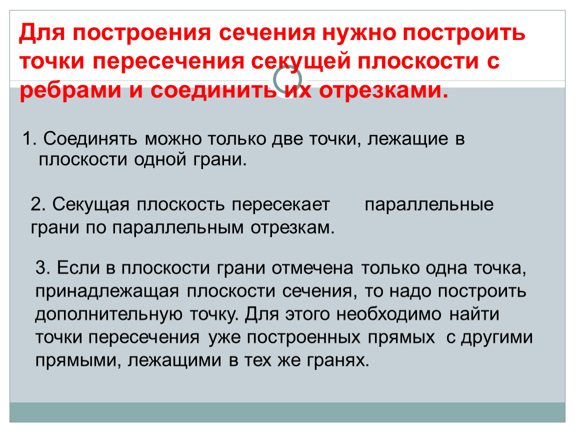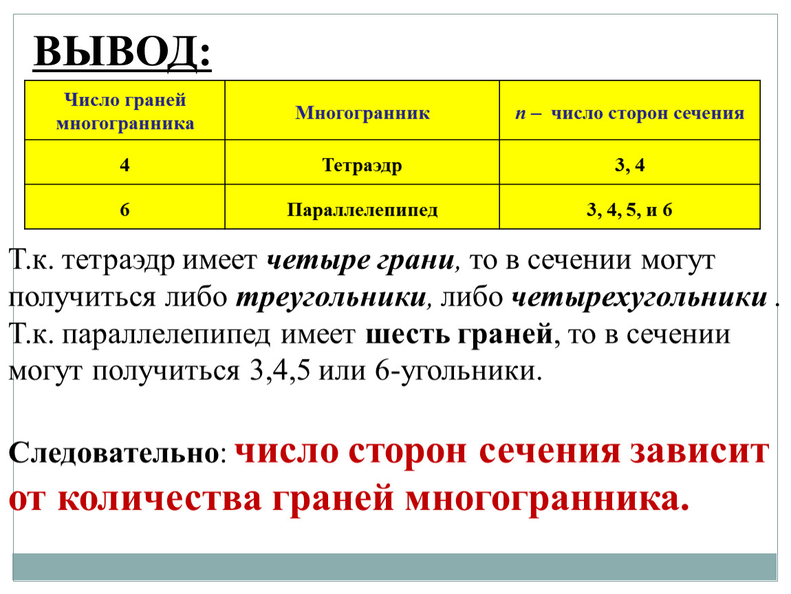 Следовательно: число сторон сечения зависит от количества граней многогранника.