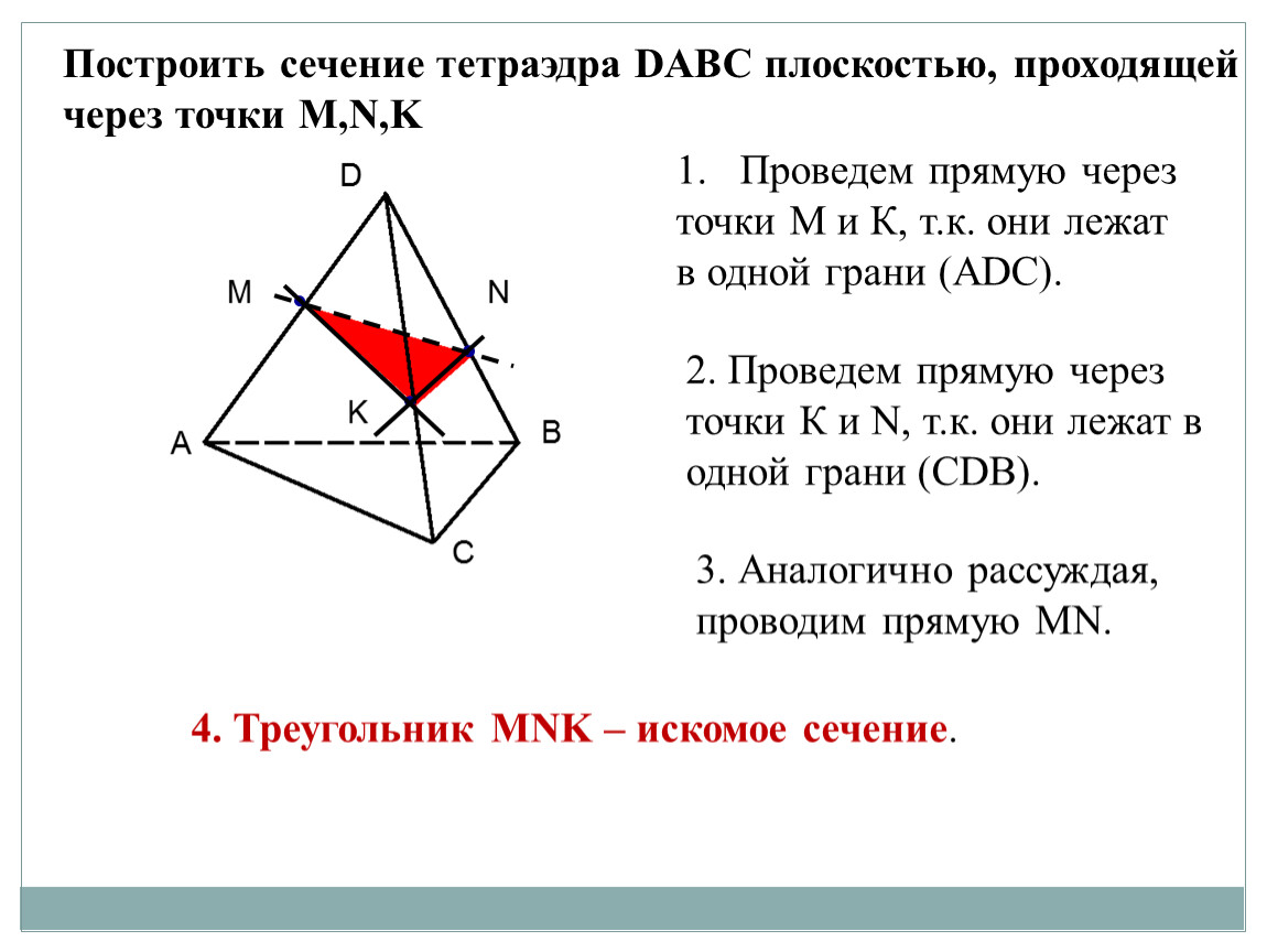 Построить сечение тетраэдра DABC плоскостью, проходящей через точки M,N,K
