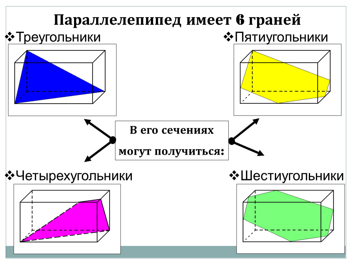 Т.к. параллелепипед имеет шесть граней, то в сечении могут получиться 3,4,5 или 6-угольники.
