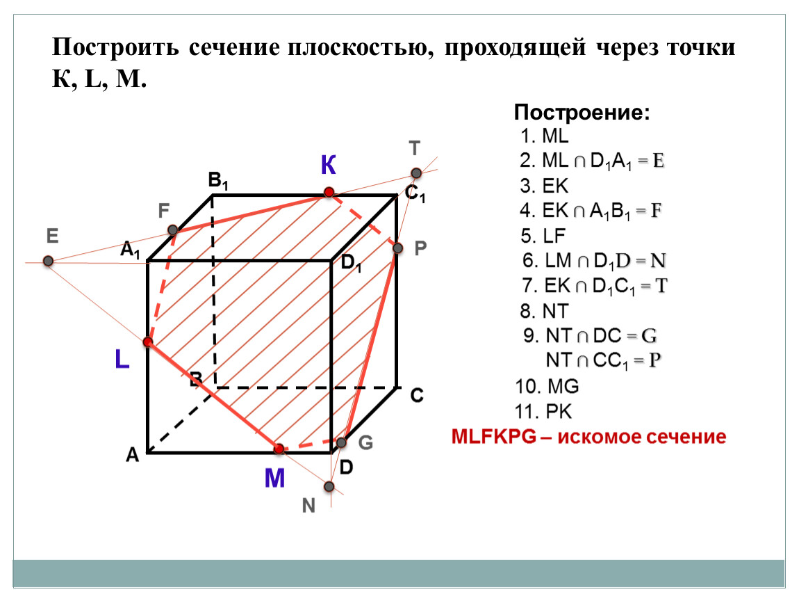 Построить сечение плоскостью, проходящей через точки К, L, М.