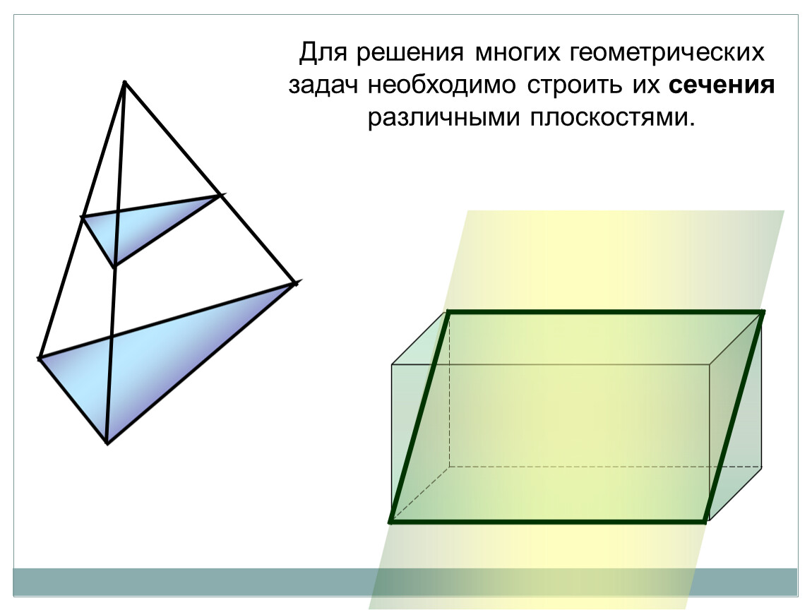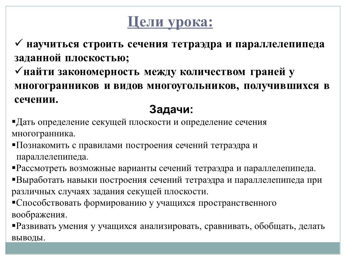научиться строить сечения тетраэдра и параллелепипеда заданной плоскостью;