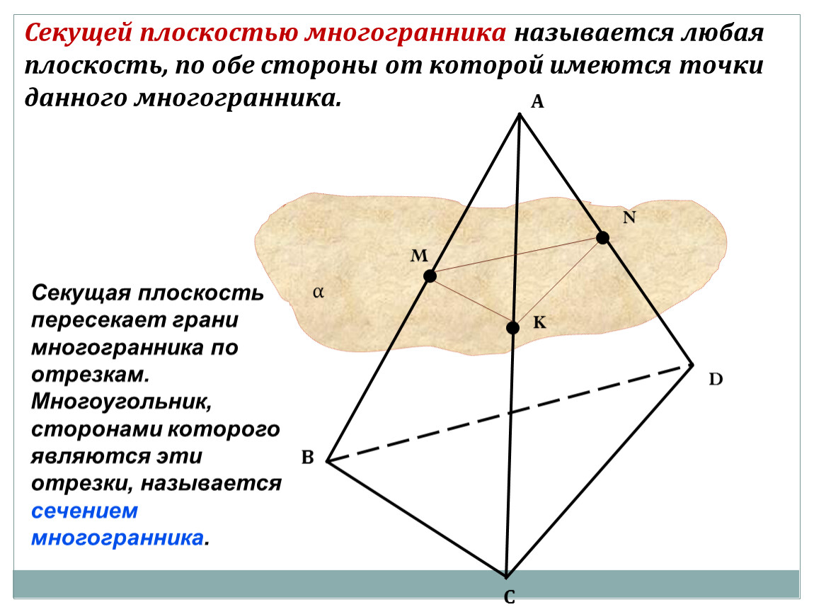Секущей плоскостью многогранника называется любая плоскость, по обе стороны от которой имеются точки данного многогранника.