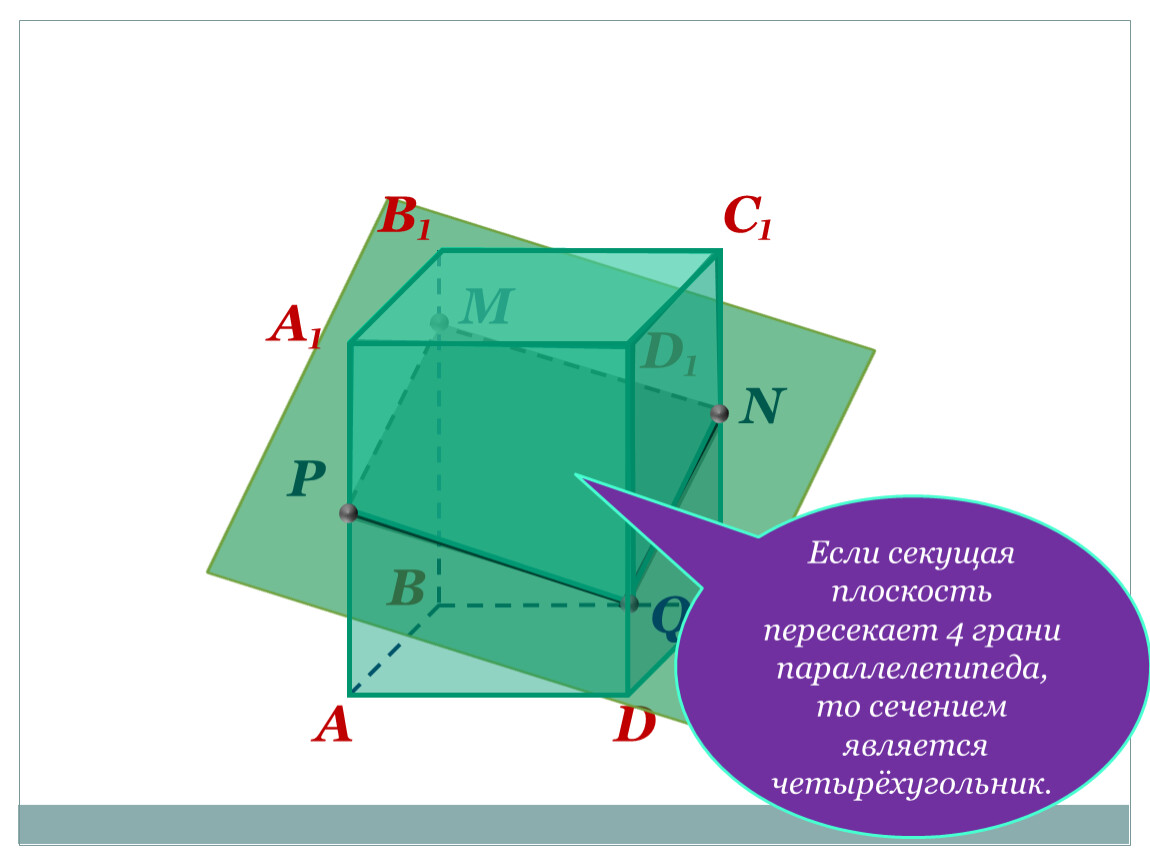 Если секущая плоскость пересекает 4 грани параллелепипеда, то сечением