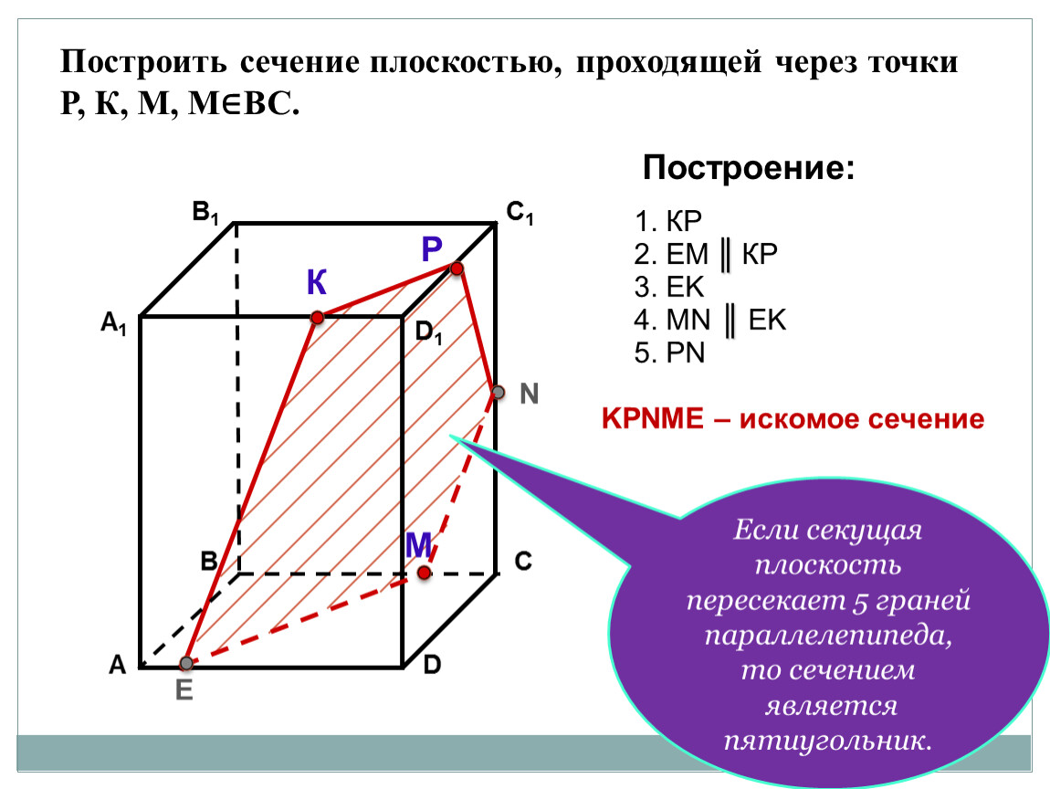 Если секущая плоскость пересекает 5 граней параллелепипеда, то сечением