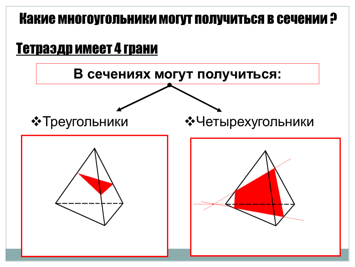 Т.к. тетраэдр имеет четыре грани, то в сечении могут получиться либо треугольники, либо четырехугольники .