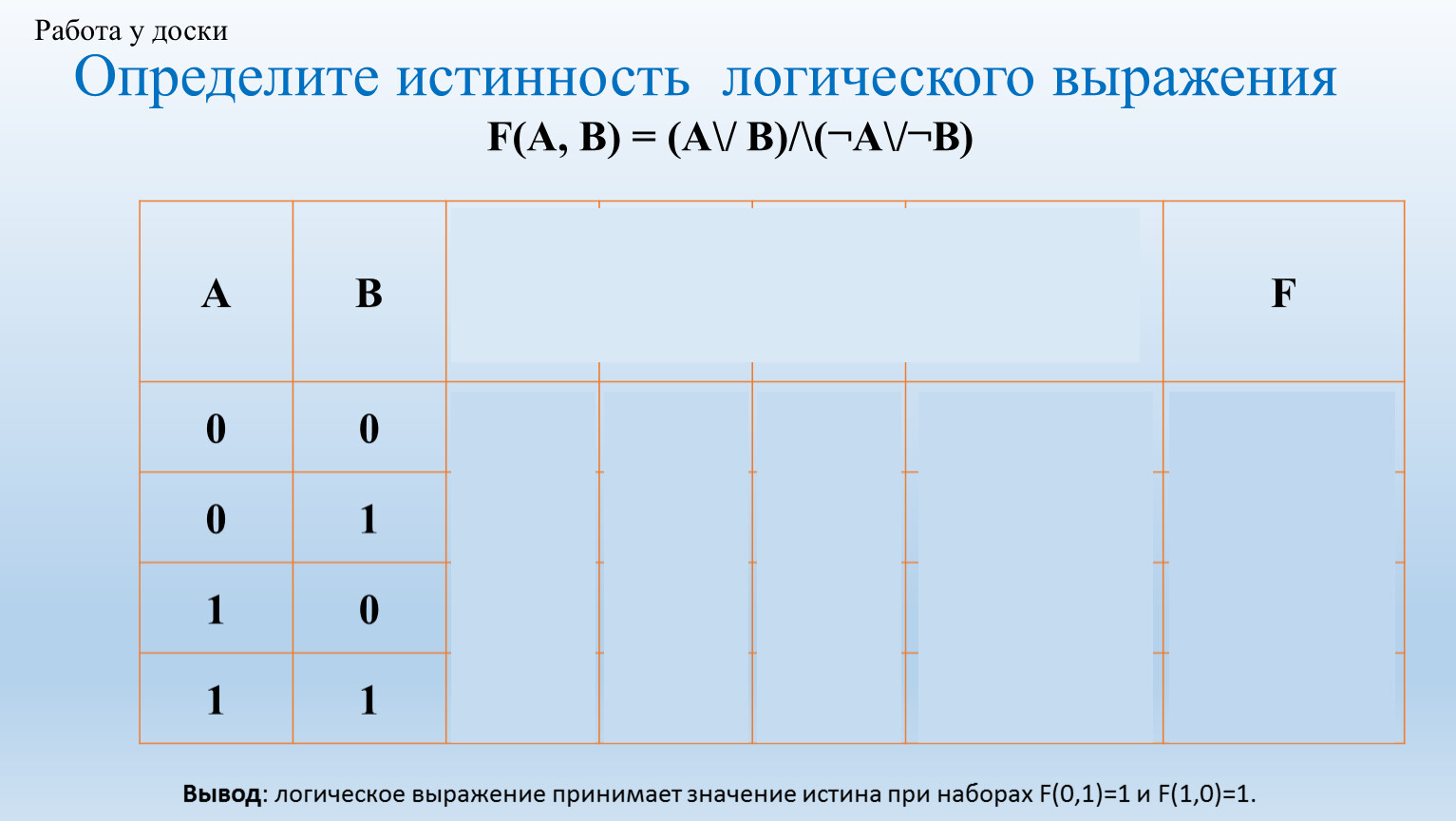Вывод: логическое выражение принимает значение истина при наборах F(0,1)=1 и F(1,0)=1.