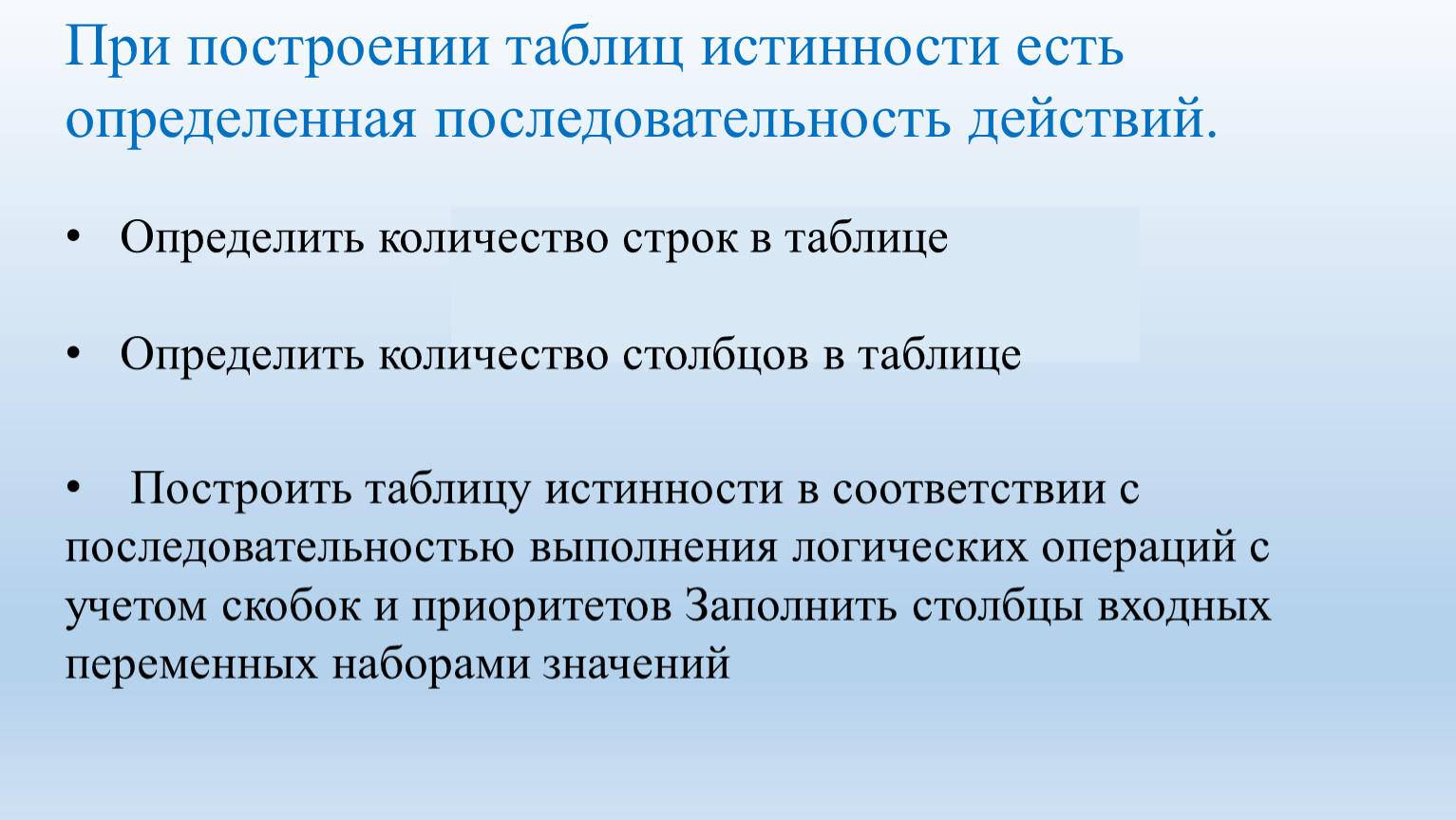 При построении таблиц истинности есть определенная последовательность действий.