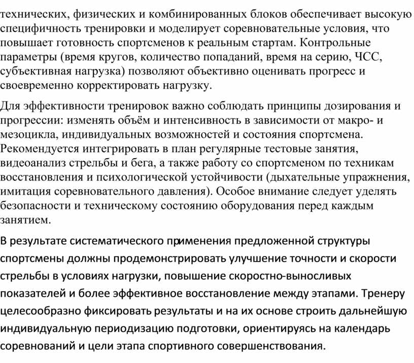 В результате систематического применения предложенной структуры спортсмены должны продемонстрировать улучшение точности и скорости стрельбы в условиях нагрузки, повышение скоростно‑выносливых показателей и более эффективное восстановление между этапами. Тренеру целесообразно фиксировать результаты и на их основе строить дальнейшую индивидуальную периодизацию подготовки, ориентируясь на календарь соревнований и цели этапа спортивного совершенствования.