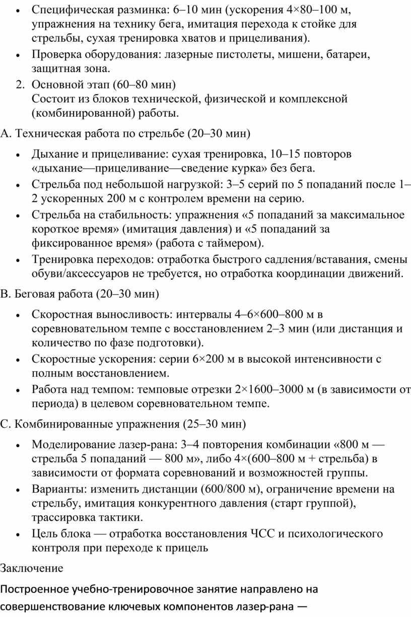 Построенное учебно‑тренировочное занятие направлено на совершенствование ключевых компонентов лазер‑рана — скоростно‑выносливой подготовки, точности стрельбы под нагрузкой и навыков быстрого перехода между бегом и стрельбой. Сочетание технических, физических и комбинированных блоков обеспечивает высокую специфичность тренировки и моделирует соревновательные условия, что повышает готовность спортсменов к реальным стартам. Контрольные параметры (время кругов, количество попаданий, время на серию, ЧСС, субъективная нагрузка) позволяют объективно оценивать прогресс и своевременно корректировать нагрузку.