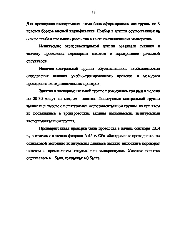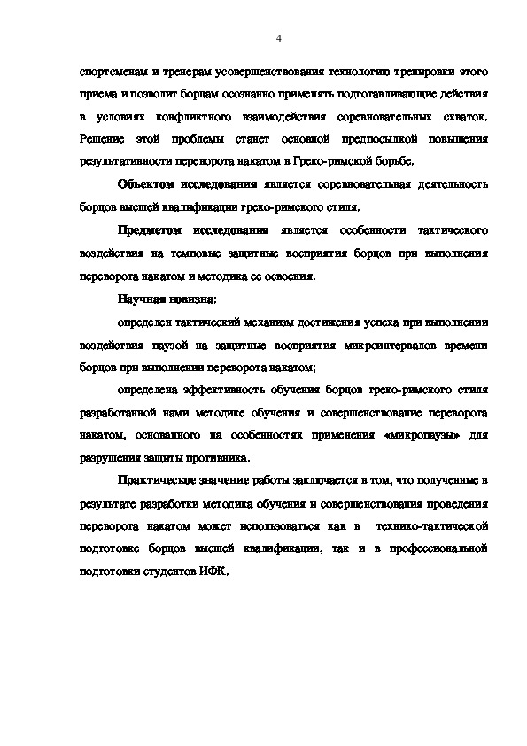У высококвалифицированных борцов Греко-римского стиля часто наблюдаются ситуации, когда они технически правильно могут выполнить переворот накатом, однако на уровне ответственных соревнований в конфликтном взаимодействии у них обнаруживается нестабильная результативность. Это связано с тем, что они осознанно не владеют механизмами достижения успеха в тактическом воздействии на противника. Поэтому возникла проблема исследования механизма разрушение «микропаузой» темповой структуры восприятия противником атакующих действий при выполнении наката в греко-римской борьбе.
