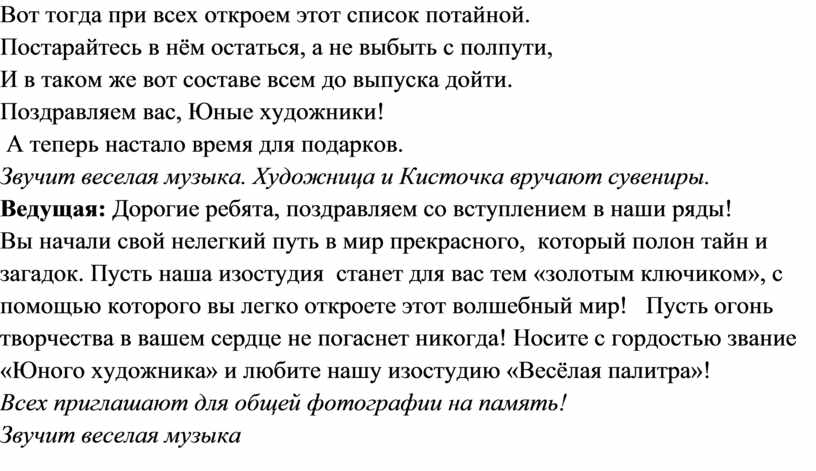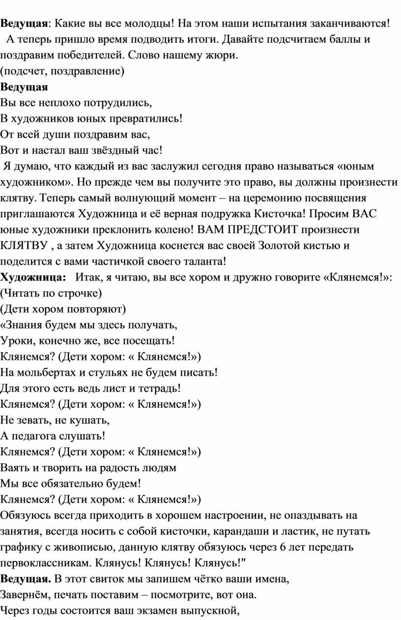 Обязуюсь всегда приходить в хорошем настроении, не опаздывать на занятия, всегда носить с собой кисточки, карандаши и ластик, не путать графику с живописью, данную клятву обязуюсь через 6 лет передать первоклассникам. Клянусь! Клянусь! Клянусь!"