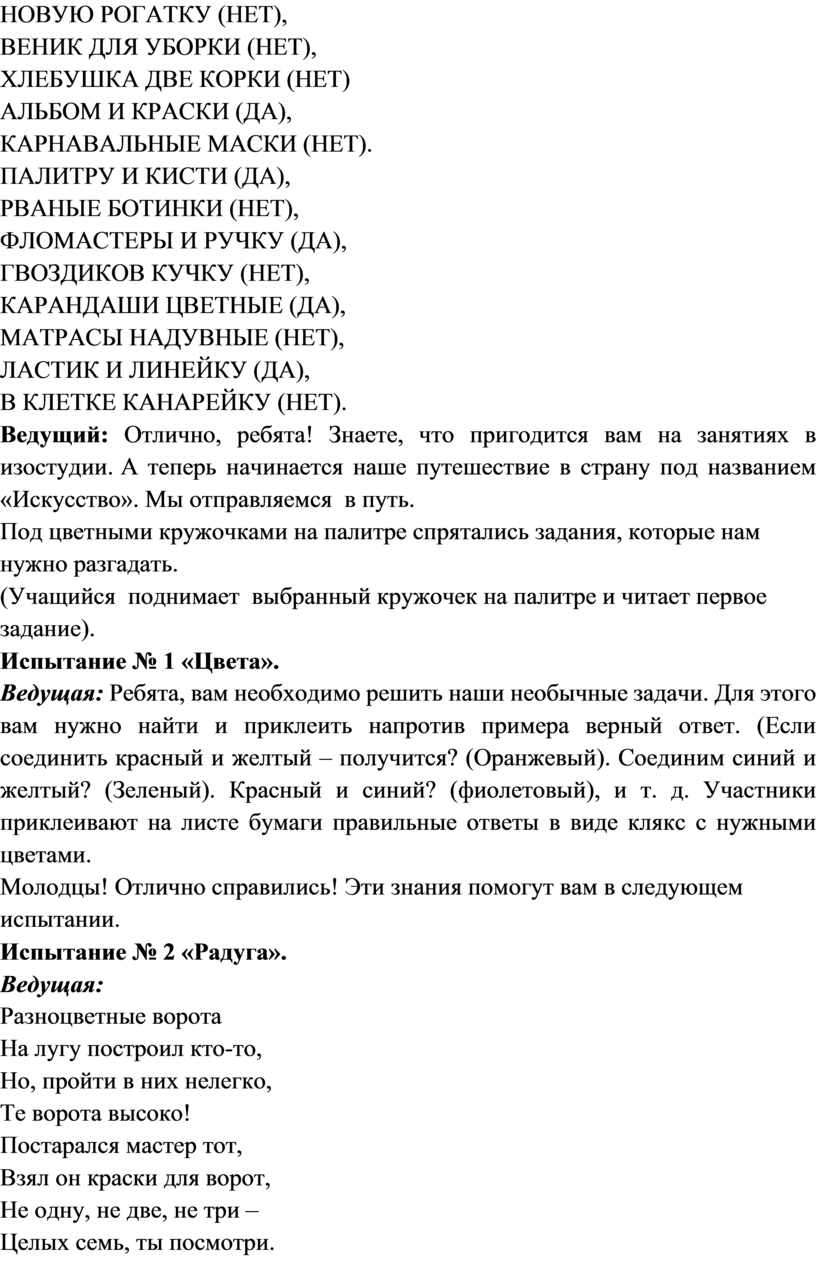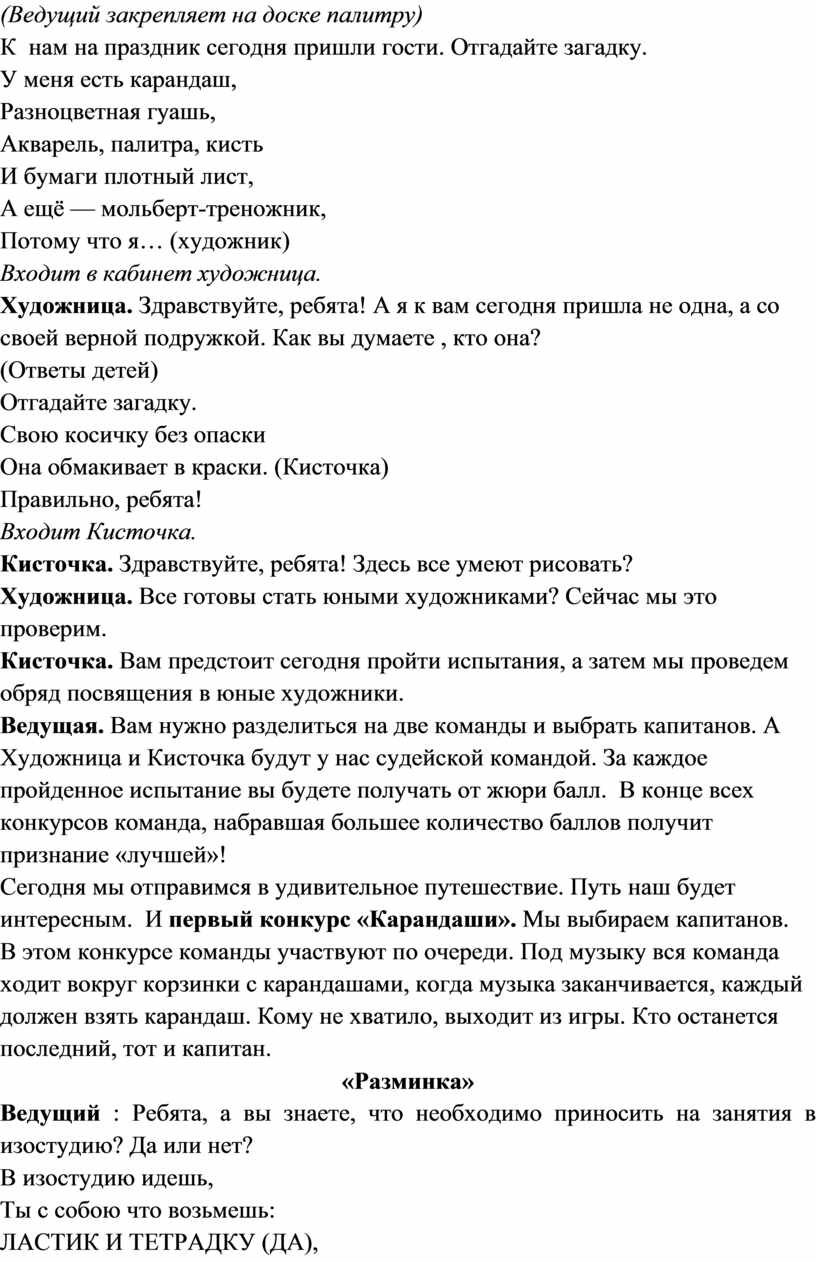 Ведущий: Отлично, ребята! Знаете, что пригодится вам на занятиях в изостудии. А теперь начинается наше путешествие в страну под названием «Искусство». Мы отправляемся в путь.