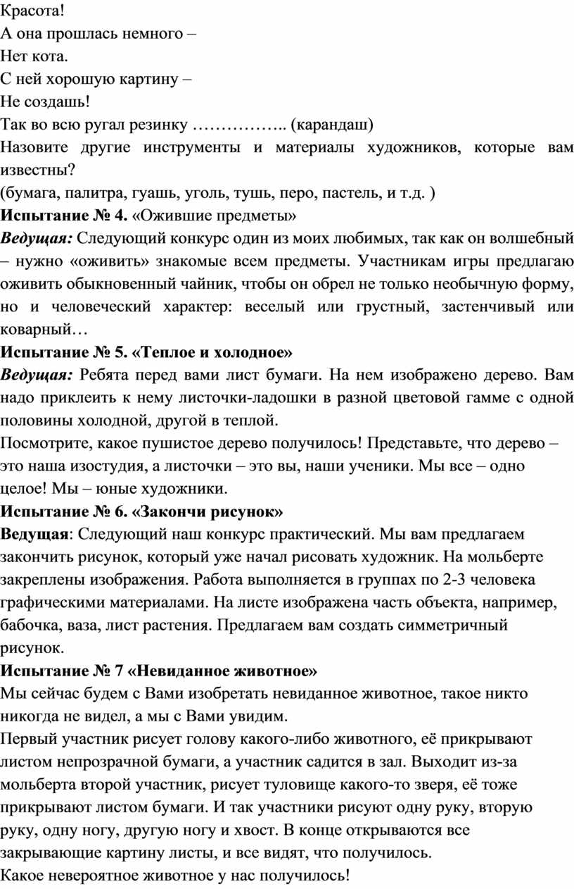 Ведущая. Вам нужно разделиться на две команды и выбрать капитанов. А Художница и Кисточка будут у нас судейской командой. За каждое пройденное испытание вы будете получать от жюри балл. В конце всех конкурсов команда, набравшая большее количество баллов получит признание «лучшей»!