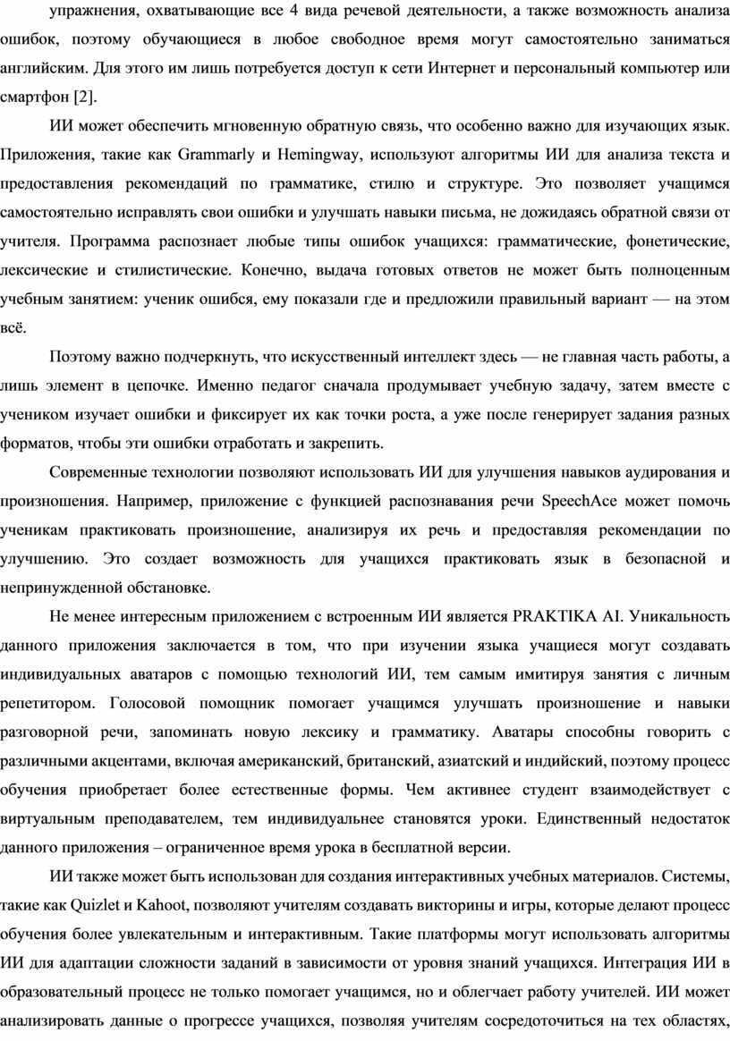 ИИ может эффективно использоваться для тренировки различных языковых навыков: чтения, письма, аудирования и говорения. А использование интерактивных приложений и игр на основе ИИ способствует повышению мотивации учащихся. Такие инструменты делают процесс обучения более увлекательным и динамичным, позволяя ученикам активно участвовать в занятиях и получать мгновенную обратную связь [2].