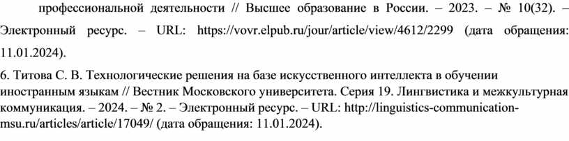 6. Титова С. В. Технологические решения на базе искусственного интеллекта в обучении иностранным языкам // Вестник Московского университета. Серия 19. Лингвистика и межкультурная коммуникация. – 2024. – № 2. – Электронный ресурс. – URL: http://linguistics-communication-msu.ru/articles/article/17049/ (дата обращения: 11.01.2024).