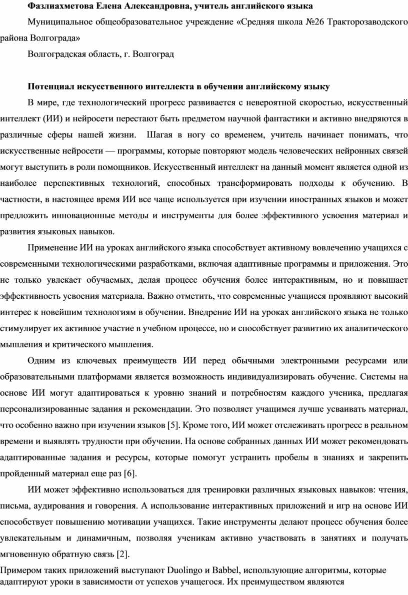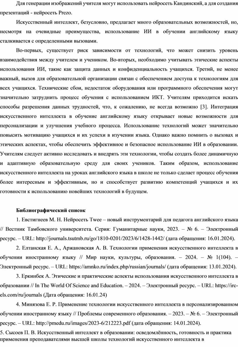 4. Минязова Е. Р. Применение технологии искусственного интеллекта в персонализированном обучении иностранному языку // Проблемы современного образования. – 2023. – № 6. – Электронный ресурс. – URL: http://pmedu.ru/images/2023-6/212223.pdf (дата обращения: 14.01.2024).