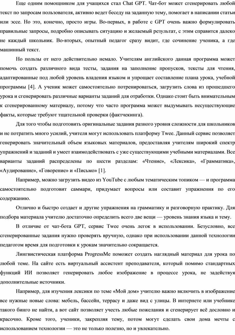 В мире, где технологический прогресс развивается с невероятной скоростью, искусственный интеллект (ИИ) и нейросети перестают быть предметом научной фантастики и активно внедряются в различные сферы нашей жизни. Шагая в ногу со временем, учитель начинает понимать, что искусственные нейросети — программы, которые повторяют модель человеческих нейронных связей могут выступить в роли помощников. Искусственный интеллект на данный момент является одной из наиболее перспективных технологий, способных трансформировать подходы к обучению. В частности, в настоящее время ИИ все чаще используется при изучении иностранных языков и может предложить инновационные методы и инструменты для более эффективного усвоения материал и развития языковых навыков.