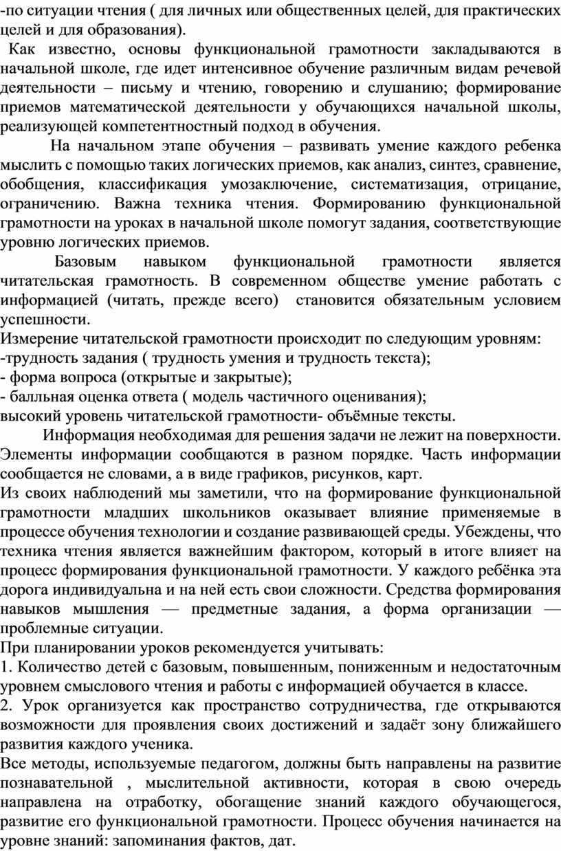 Из своих наблюдений мы заметили, что на формирование функциональной грамотности младших школьников оказывает влияние применяемые в процессе обучения технологии и создание развивающей среды. Убеждены, что техника чтения является важнейшим фактором, который в итоге влияет на процесс формирования функциональной грамотности. У каждого ребёнка эта дорога индивидуальна и на ней есть свои сложности. Средства формирования навыков мышления — предметные задания, а форма организации — проблемные ситуации.